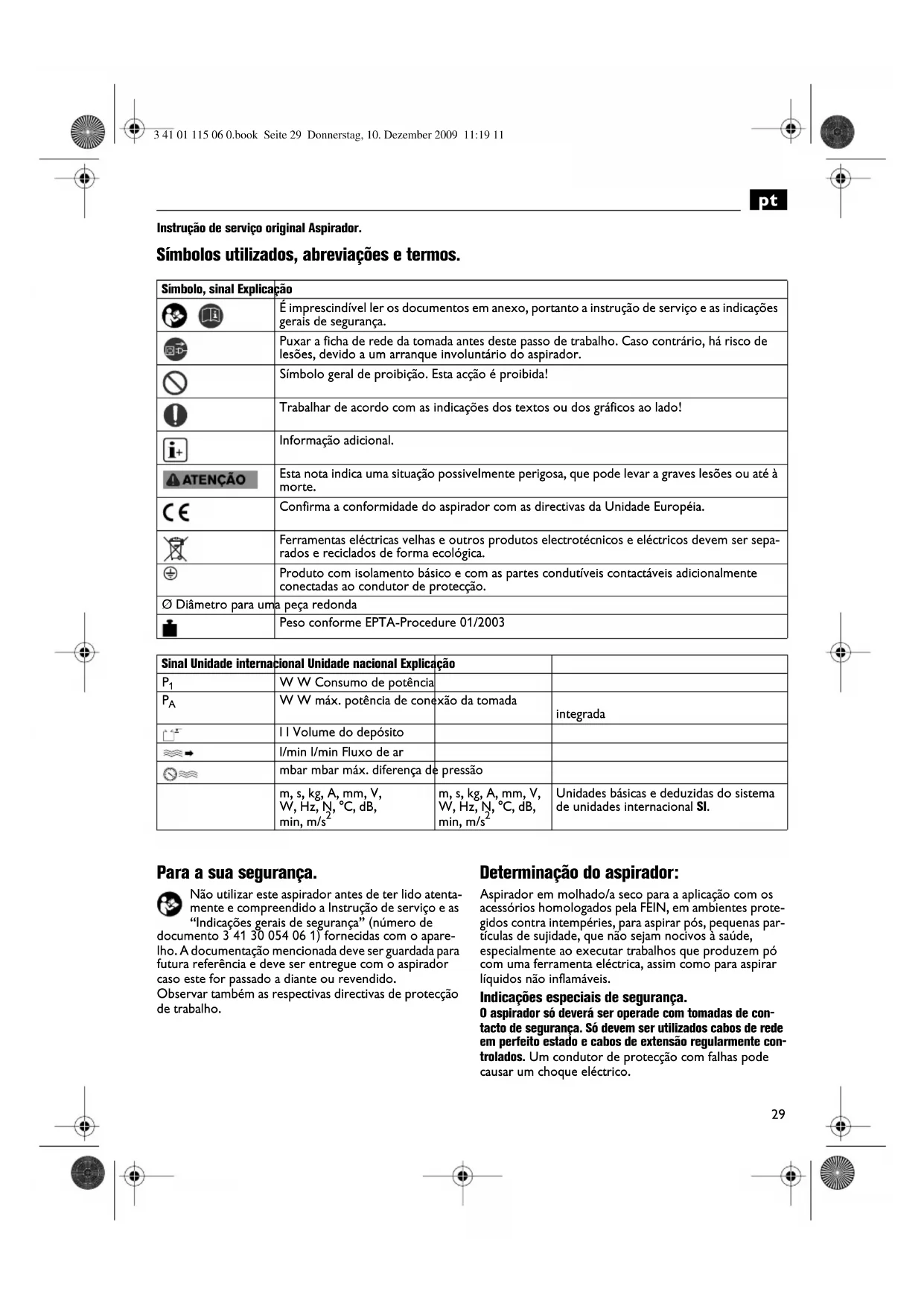 Instrução de serviço original Aspirador. Símbolos utilizados, abreviações e termos. Para a sua segurança. Não utilizar este aspirador antes de ter lido atenta- mente e compreendido a Instrução de serviço e as “Indicações gerais de segurança” (número de documento 3 41 30 054 06 1) fornecidas com o apare- lho. A documentação mencionada deve ser guardada para futura referência e deve ser entregue com o aspirador caso este for passado a diante ou revendido. Observar também as respectivas directivas de protecção de trabalho. Determinação do aspirador: Aspirador em molhado/a seco para a aplicação com os acessórios homologados pela FEIN, em ambientes prote- gidos contra intempéries, para aspirar pós, pequenas par- tículas de sujidade, que não sejam nocivos à saúde, especialmente ao executar trabalhos que produzem pó com uma ferramenta eléctrica, assim como para aspirar líquidos não inflamáveis. Indicações especiais de segurança. O aspirador só deverá ser operade com tomadas de con- tacto de segurança. Só devem ser utilizados cabos de rede em perfeito estado e cabos de extensão regularmente con- trolados. Um condutor de protecção com falhas pode causar um choque eléctrico. Símbolo, sinal Explicação É imprescindível ler os documentos em anexo, portanto a instrução de serviço e as indicações gerais de segurança. Puxar a ficha de rede da tomada antes deste passo de trabalho. Caso contrário, há risco de lesões, devido a um arranque involuntário do aspirador. Símbolo geral de proibição. Esta acção é proibida! Trabalhar de acordo com as indicações dos textos ou dos gráficos ao lado! Informação adicional. Esta nota indica uma situação possivelmente perigosa, que pode levar a graves lesões ou até à morte. Confirma a conformidade do aspirador com as directivas da Unidade Européia. Ferramentas eléctricas velhas e outros produtos electrotécnicos e eléctricos devem ser sepa- rados e reciclados de forma ecológica. Produto com isolamento básico e com as partes condutíveis contactáveis adicionalmente conectadas ao condutor de protecção. Ø Diâmetro para uma peça redonda Peso conforme EPTA-Procedure 01/2003 Sinal Unidade internacional Unidade nacional Explicação