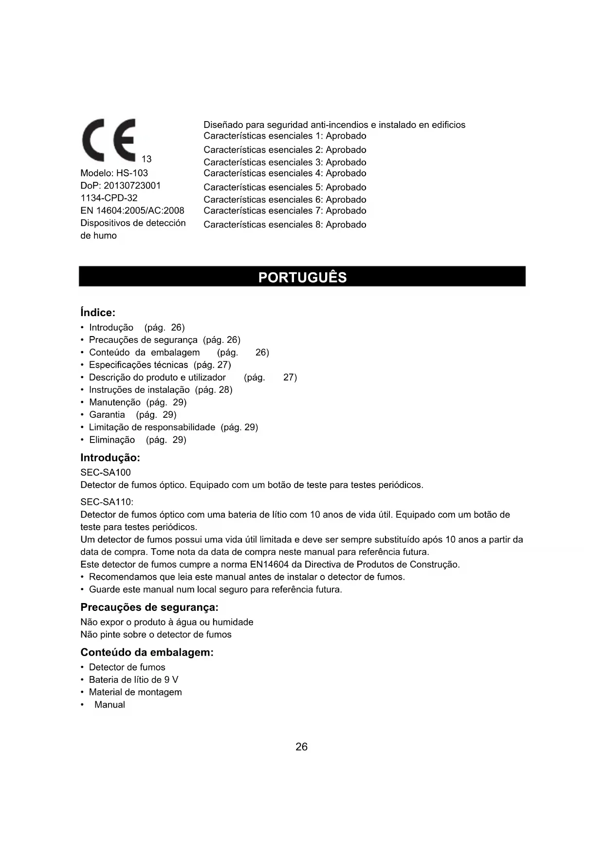 Este detector de fumos cumpre a norma EN14604 da Directiva de Produtos de Construção.