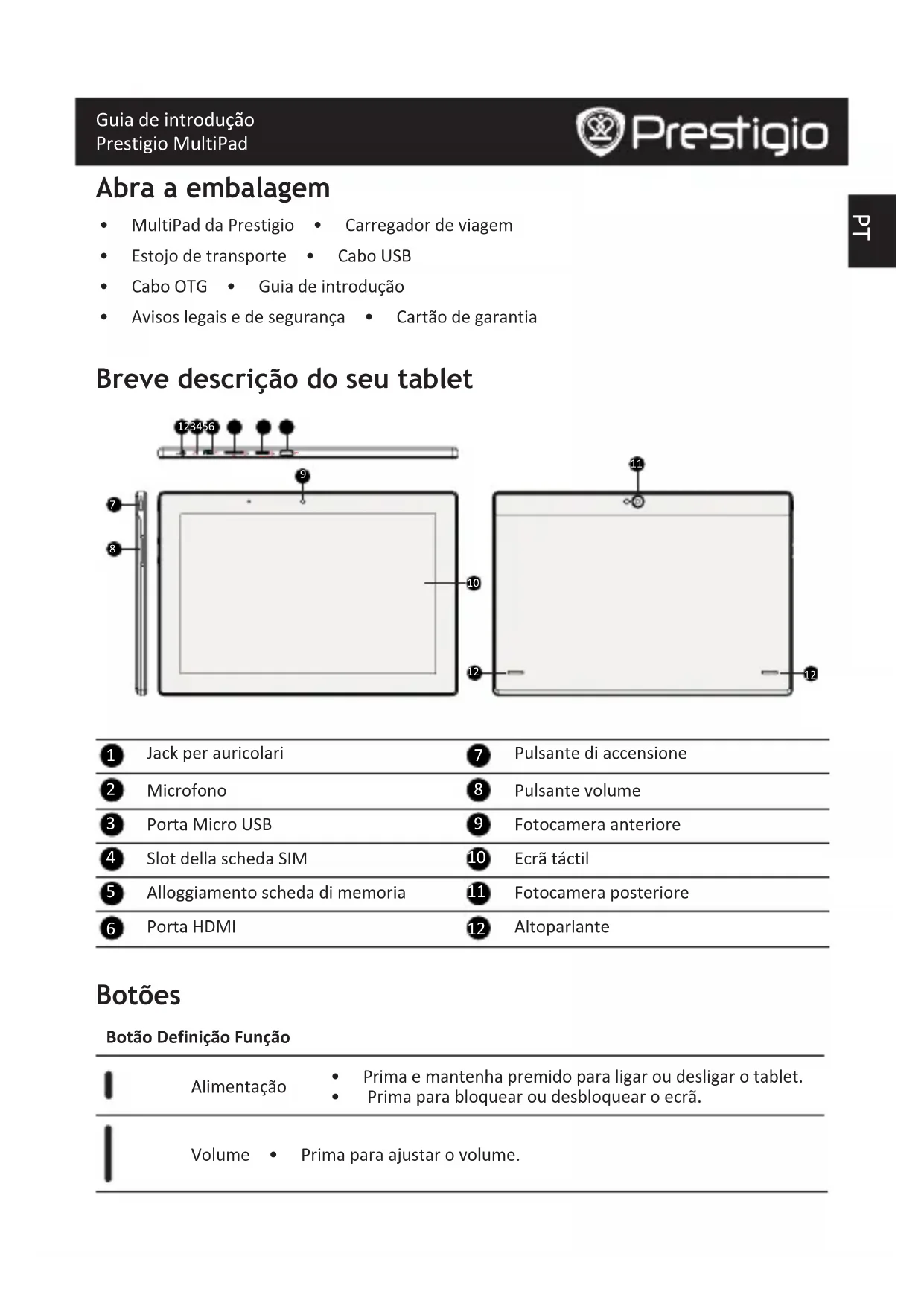 - Primaparabloquearoudesbloquearoecrã. Volume • Primaparaajustarovolume.PT Guia de introdução Prestigio MultiPad Voltar