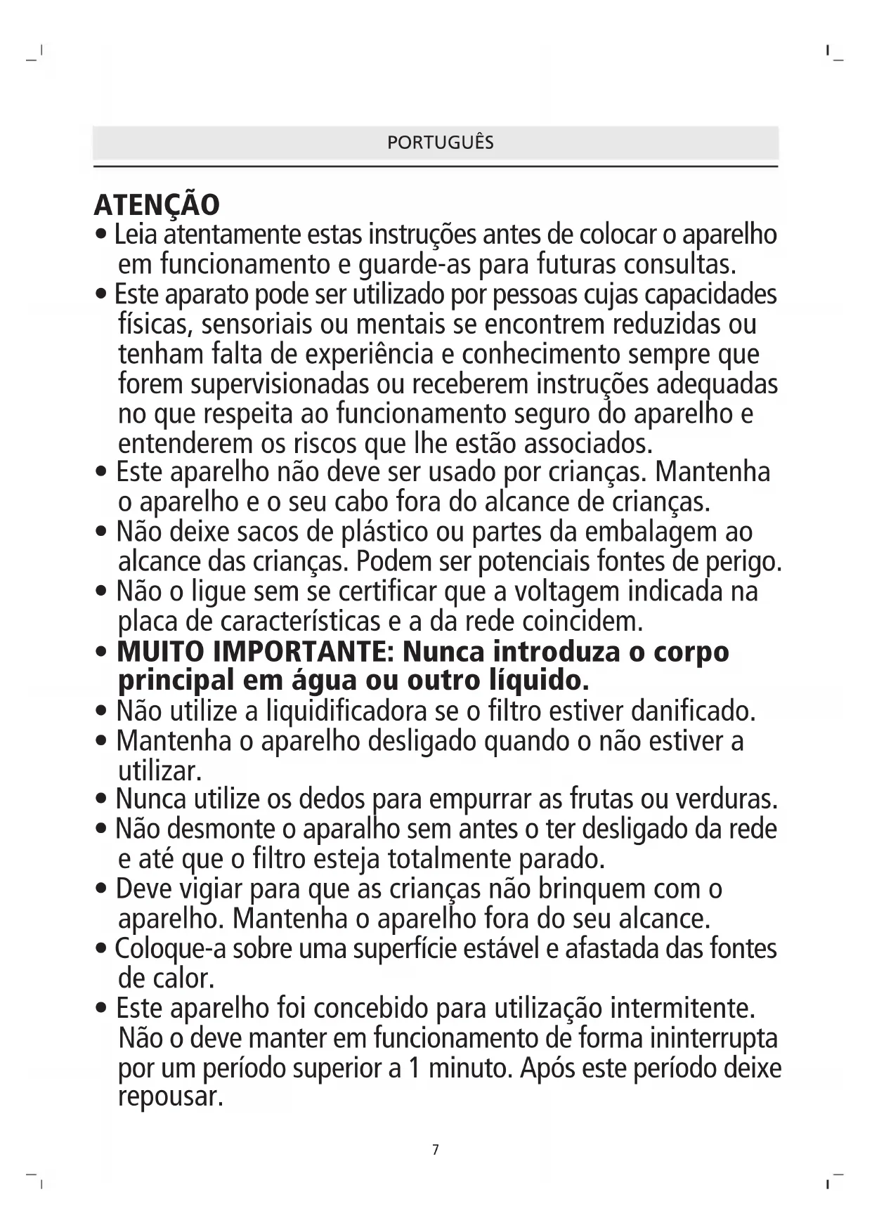 - Este aparelho foi concebido para utilização intermitente. Não o deve manter em funcionamento de forma ininterrupta por um período superior a 1 minuto. Após este período deixe repousar.8 ATENÇÃO: o aparelho possui um sistema de segurança que o desliga automaticamente se ocorrer um sobreaquecimento. Se tal suceder desligue-o da rede e espere, aproximadamente, 30 minutos antes de o colocar de novo em funcionamento.
