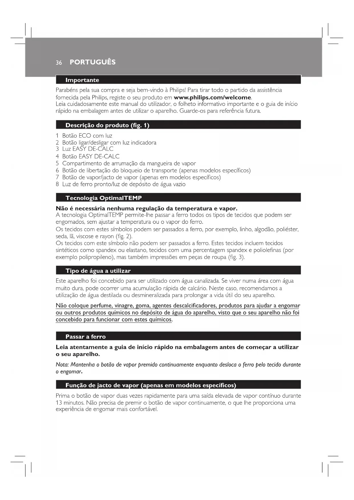 MANUAL DE UTILIZADOR PerfectCare Aqua GC8651 PHILIPS