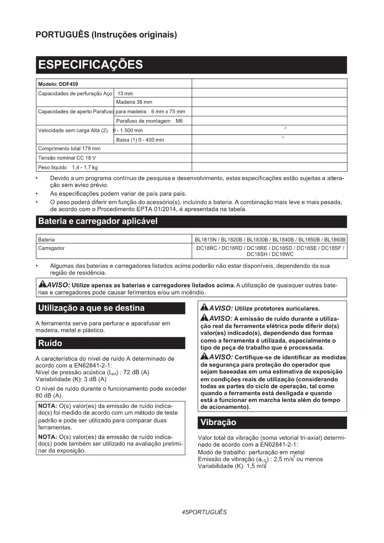 Encontre gratuitamente o manual do aparelho DDF459 MAKITA em formato PDF.