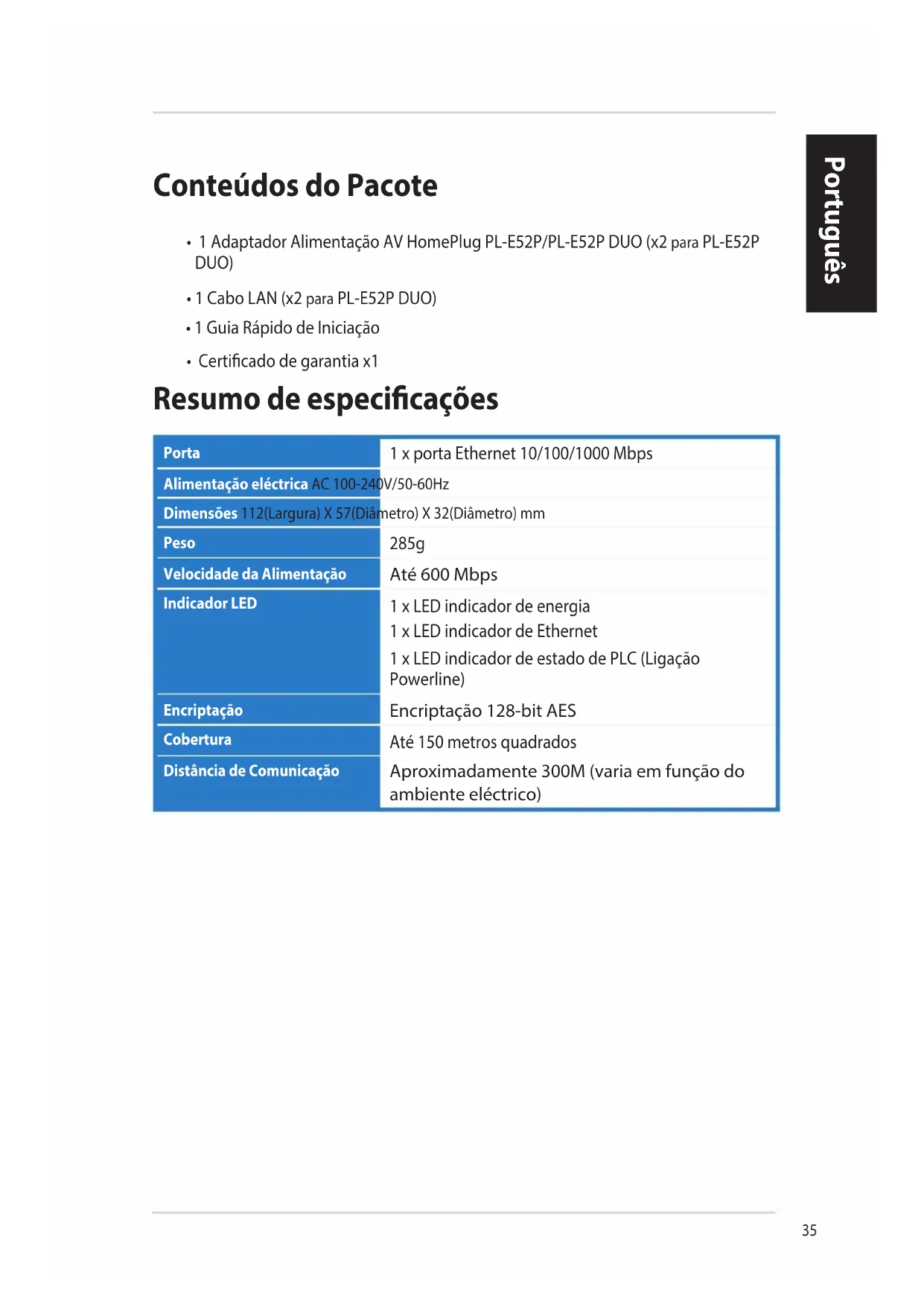 • 1 Adaptador Alimentação AV HomePlug PL-E52P/PL-E52P DUO (x2 para PL-E52P DUO)