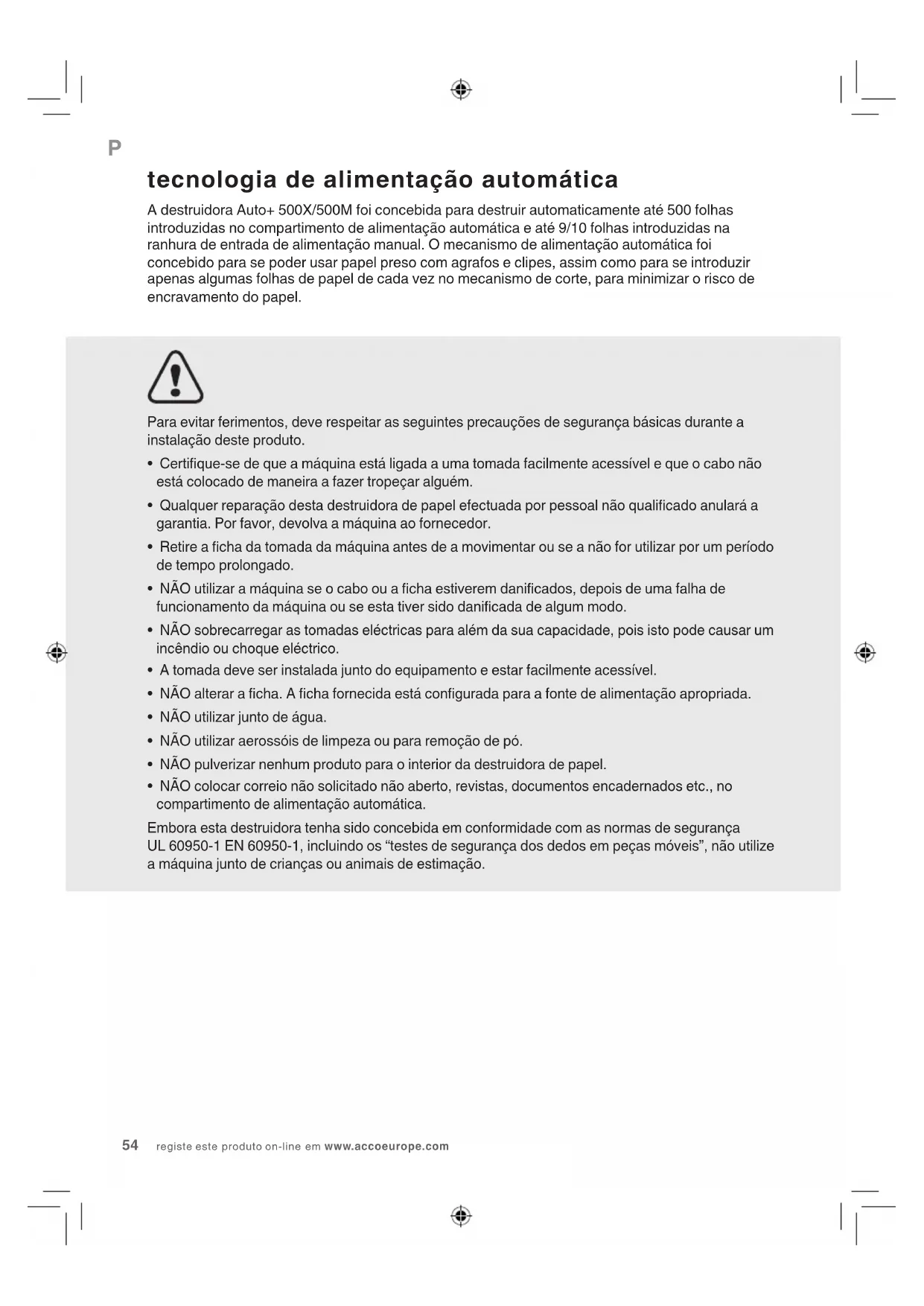 - A ACCO Brands Europe não se responsabiliza pelo desempenho ou segurança da destruidora se utilizar outros tipos ou marcas de lubricantes para lubricar a(s) peça(s) desta máquina.58 registe este produto on-line em www.accoeurope.com
