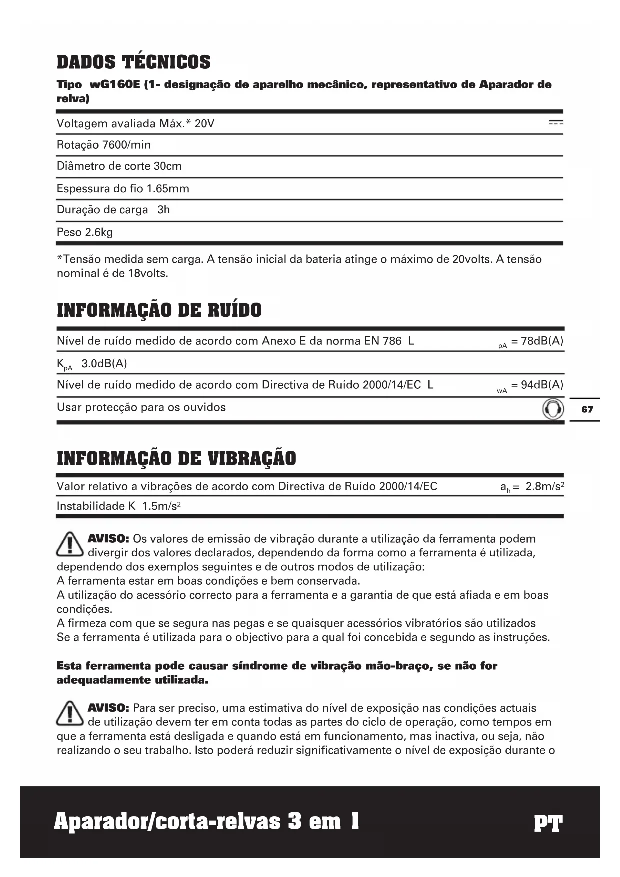 Encontre gratuitamente o manual do aparelho WG160E WORX em formato PDF.