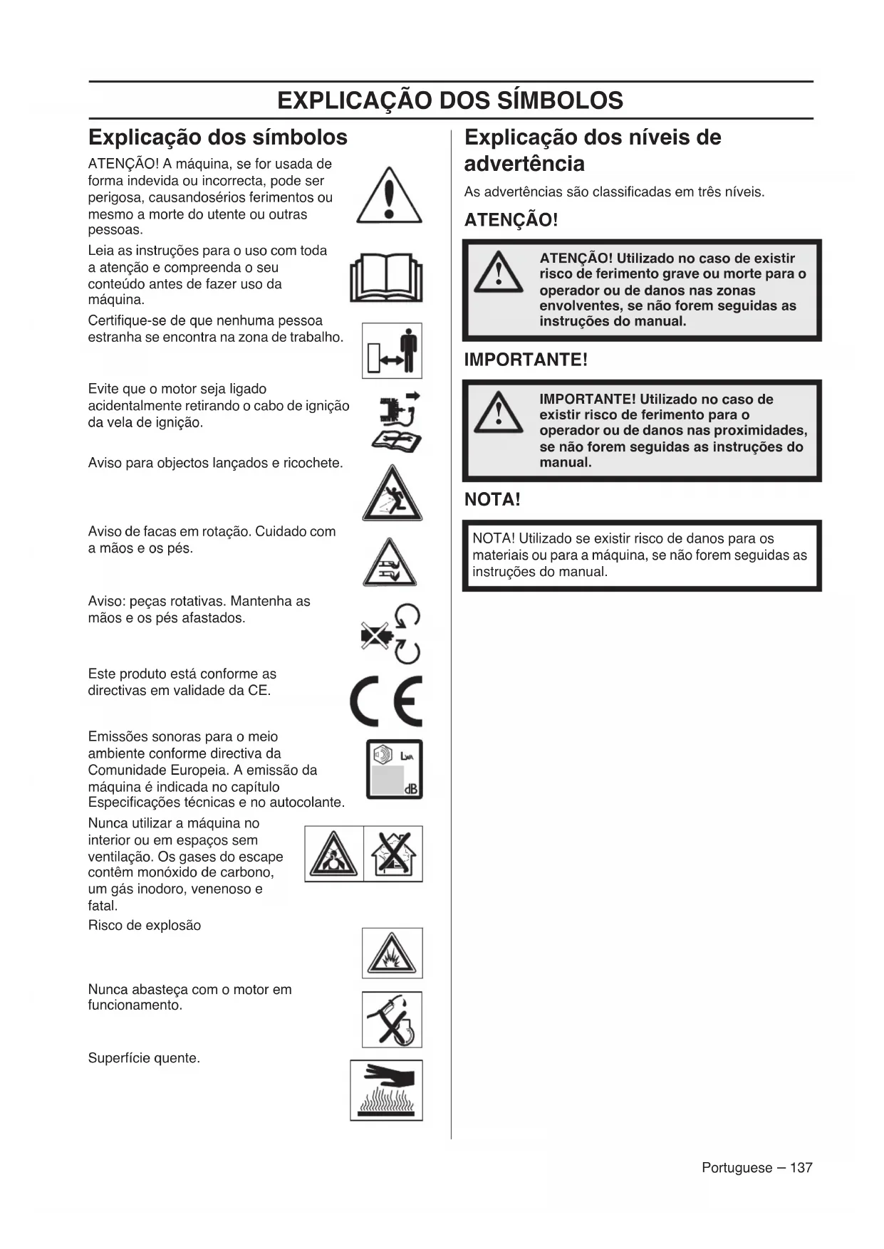 John Thompson, Produkt- und Marketingdirektor EUAP. (Bevollmächtigter Vertreter für Husqvarna AB, verantwortlich für die technische Dokumentation.)EXPLICAÇÃO DOS SÍMBOLOS Portuguese – 137 Explicação dos símbolos ATENÇÃO! A máquina, se for usada de forma indevida ou incorrecta, pode ser perigosa, causandosérios ferimentos ou mesmo a morte do utente ou outras pessoas.Leia as instruções para o uso com toda a atenção e compreenda o seu conteúdo antes de fazer uso da máquina.Certifique-se de que nenhuma pessoa estranha se encontra na zona de trabalho.Evite que o motor seja ligado acidentalmente retirando o cabo de ignição da vela de ignição.Aviso para objectos lançados e ricochete.Aviso de facas em rotação. Cuidado com a mãos e os pés.Aviso: peças rotativas. Mantenha as mãos e os pés afastados.Este produto está conforme as directivas em validade da CE.Emissões sonoras para o meio ambiente conforme directiva da Comunidade Europeia. A emissão da máquina é indicada no capítulo Especificações técnicas e no autocolante.Nunca utilizar a máquina no interior ou em espaços sem ventilação. Os gases do escape contêm monóxido de carbono, um gás inodoro, venenoso e fatal.Risco de explosãoNunca abasteça com o motor em funcionamento.Superfície quente. Explicação dos níveis de advertência As advertências são classificadas em três níveis. ATENÇÃO! IMPORTANTE! NOTA!