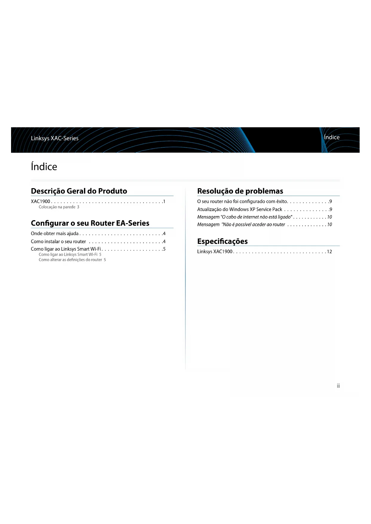Baixe as instruções para o seu Roteador em formato PDF gratuitamente! Encontre o seu manual XAC1900 - LINKSYS e retome o controlo do seu dispositivo eletrónico. Nesta página estão publicados todos os documentos necessários para a utilização do seu dispositivo. XAC1900 da marca LINKSYS.