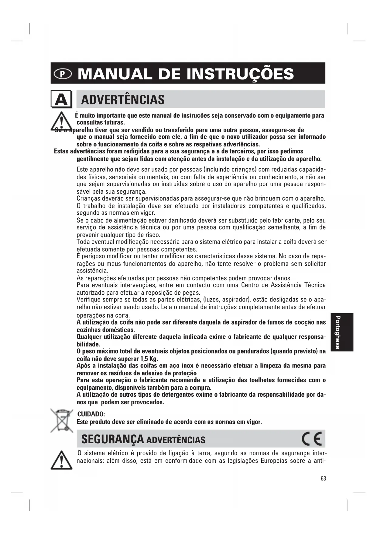 CUIDADO:Este produto deve ser eliminado de acordo com as normas em vigor. SEGURANÇA ADVERTÊNCIAS O sistema elétrico é provido de ligação à terra, segundo as normas de segurança inter-nacionais; além disso, está em conformidade com as legislações Europeias sobre a anti-Portoghese64
