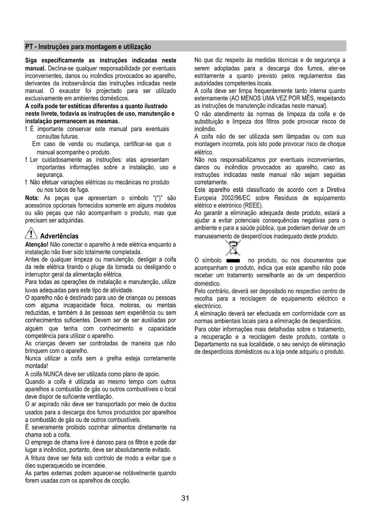 Sigaspecificamenteasinstruçõesindicadasneste manual.Declina-se qualquerresponsabildade poreventualis inconvenrientes,danos ou incéndiosprovocadosaoaparelho, derivantesdainobservança dasinstruçõesindicadasnesthemanual.Oexaustorfoiprojectado para serutilidoxclusivamente emambiente Domesticos.