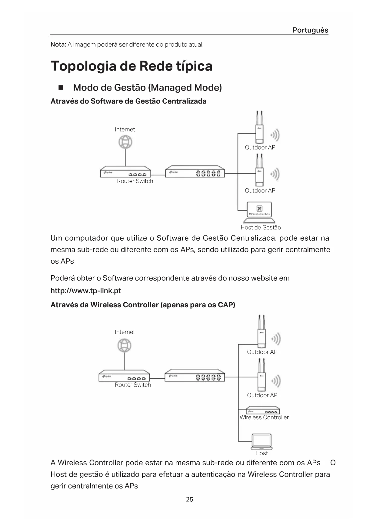 Nota: A imagem poderá ser diferente do produto atual. Topologia de Rede típica ■ Modo de Gestão (Managed Mode) Através do Software de Gestão Centralizada Management Software Um computador que utilize o Software de Gestão Centralizada, pode estar na mesma sub-rede ou diferente com os APs, sendo utilizado para gerir centralmente os APs Poderá obter o Software correspondente através do nosso website em http://www.tp-link.pt Através da Wireless Controller (apenas para os CAP) A Wireless Controller pode estar na mesma sub-rede ou diferente com os APs O Host de gestão é utilizado para efetuar a autenticação na Wireless Controller para gerir centralmente os APs Router Switch Internet Host de Gestão Outdoor AP Outdoor AP Router Switch Internet Outdoor AP Outdoor AP Wireless Controller HostPortuguês