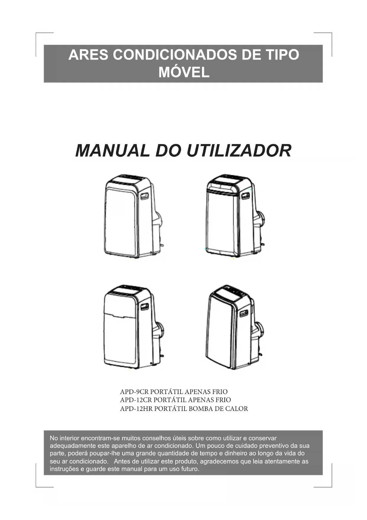 APD-12HR PORTÁTIL BOMBA DE CALORNo interior encontram-se muitos conselhos úteis sobre como utilizar e conservar adequadamente este aparelho de ar condicionado. Um pouco de cuidado preventivo da sua parte, poderá poupar- lhe uma grande quantidade de tempo e dinheiro ao longo da vida do seu ar condicionado. No quadro de conselhos para resolução de problemas, poderão ser encontradas muitas respostas para os problemas mais comuns. Se analisar o nosso quadro ou as Dicas de Resolução de Problemas primeiro, poderá não precisar contactar a assistência. Ler este manual