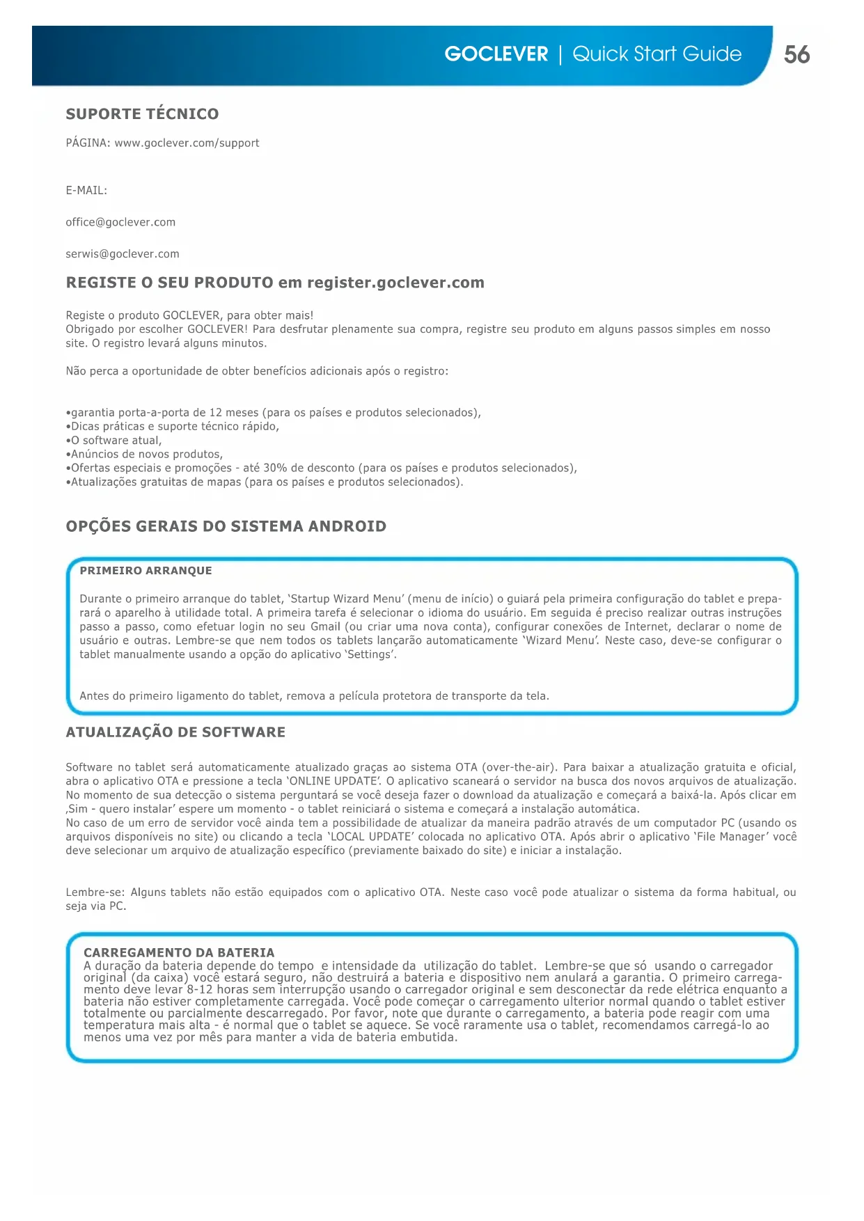 PRIMEIRO ARRANQUE Durante o primeiro arranque do tablet, ‘Startup Wizard Menu’ (menu de início) o guiará pela primeira configuração do tablet e prepa- rará o aparelho à utilidade total. A primeira tarefa é selecionar o idioma do usuário. Em seguida é preciso realizar outras instruções passo a passo, como efetuar login no seu Gmail (ou criar uma nova conta), configurar conexões de Internet, declarar o nome de usuário e outras. Lembre-se que nem todos os tablets lançarão automaticamente ‘Wizard Menu’. Neste caso, deve-se configurar o tablet manualmente usando a opção do aplicativo ‘Settings’.Antes do primeiro ligamento do tablet, remova a película protetora de transporte da tela. REGISTE O SEU PRODUTO em register.goclever.com Registe o produto GOCLEVER, para obter mais! Obrigado por escolher GOCLEVER! Para desfrutar plenamente sua compra, registre seu produto em alguns passos simples em nosso site. O registro levará alguns minutos.Não perca a oportunidade de obter benefícios adicionais após o registro:•garantia porta-a-porta de 12 meses (para os países e produtos selecionados),•Dicas práticas e suporte técnico rápido,•O software atual,•Anúncios de novos produtos,•Ofertas especiais e promoções - até 30% de desconto (para os países e produtos selecionados),•Atualizações gratuitas de mapas (para os países e produtos selecionados).