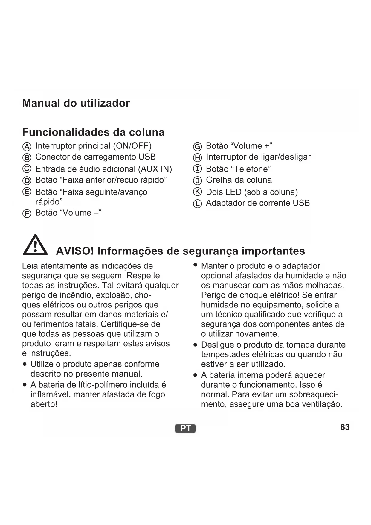 mido o interruptor de ligar/desligar até ouvir o som de desativação. Nota: O conjunto de dispositivos emparelhados por Bluetooth funciona de acordo com os protocolos supor- tados. Os smartphones, por exemplo, utilizam geralmente HFP (Hands-free prole) e A2DP (Advanced Audio Dis- tribution Prole). Portanto, neste caso, a coluna pode gerir as chamadas e controlar a reprodução de áudio. Com um leitor de MP3 com A2DP, apenas funcionará a reprodução de áudio e, com um simples telemóvel, apenas poderão ser geridas as chamadas.67