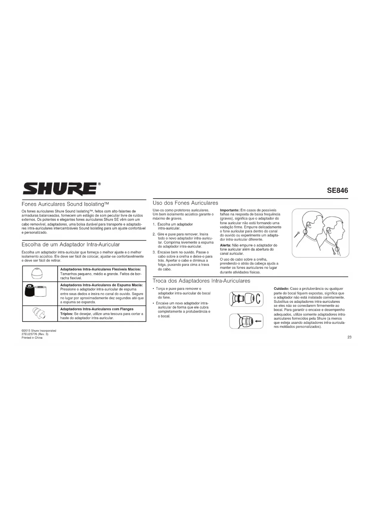 cabo sobre a orelha e deixe-o para trás. Apertar o cabo e diminua a folga, puxando para cima a trava do cabo. Importante: Em casos de possíveis falhas na resposta de baixa frequência (graves), significa que o adaptador do fone auricular não está formando uma vedação firme. Empurre delicadamente o fone auricular para dentro do canal do ouvido ou experimente um adapta- dor intra-auricular diferente. Alerta: Não empurre o adaptador do fone auricular além da abertura do canal auricular. O uso do cabo sobre a orelha, prendendo-o atrás da cabeça ajuda a manter os fones auriculares no lugar durante atividades físicas. ©2015 Shure Incorporated 27EU23776 (Rev. 3) Printed in China SE846 Fones Auriculares Sound Isolating™ Os fones auriculares Shure Sound Isolating™, feitos com alto-falantes de armaduras balanceadas, fornecem um estágio de som peculiar livre de ruídos externos. Os potentes e elegantes fones auriculares Shure SE vêm com um cabo removível, adaptadores, uma bolsa durável para transporte e adaptado- res intra-auriculares intercambiáveis Sound Isolating para um ajuste confortável e personalizado. Escolha de um Adaptador Intra-Auricular Escolha um adaptador intra-auricular que forneça o melhor ajuste e o melhor isolamento acústico. Ele deve ser fácil de colocar, ajustar-se confortavelmente e deve ser fácil de retirar. Adaptadores Intra-Auriculares Flexíveis Macios: Tamanhos pequeno, médio e grande. Feitos de bor- racha flexível. Adaptadores Intra-Auriculares de Espuma Macia: Pressione o adaptador intra-auricular de espuma entre seus dedos e insira no canal do ouvido. Segure no lugar por aproximadamente dez segundos até que a espuma se expanda. Adaptadores Intra-Auriculares com Flanges Triplos: Se desejar, utilize uma tesoura para cortar a haste do adaptador intra-auricular. Troca dos Adaptadores Intra-Auriculares
