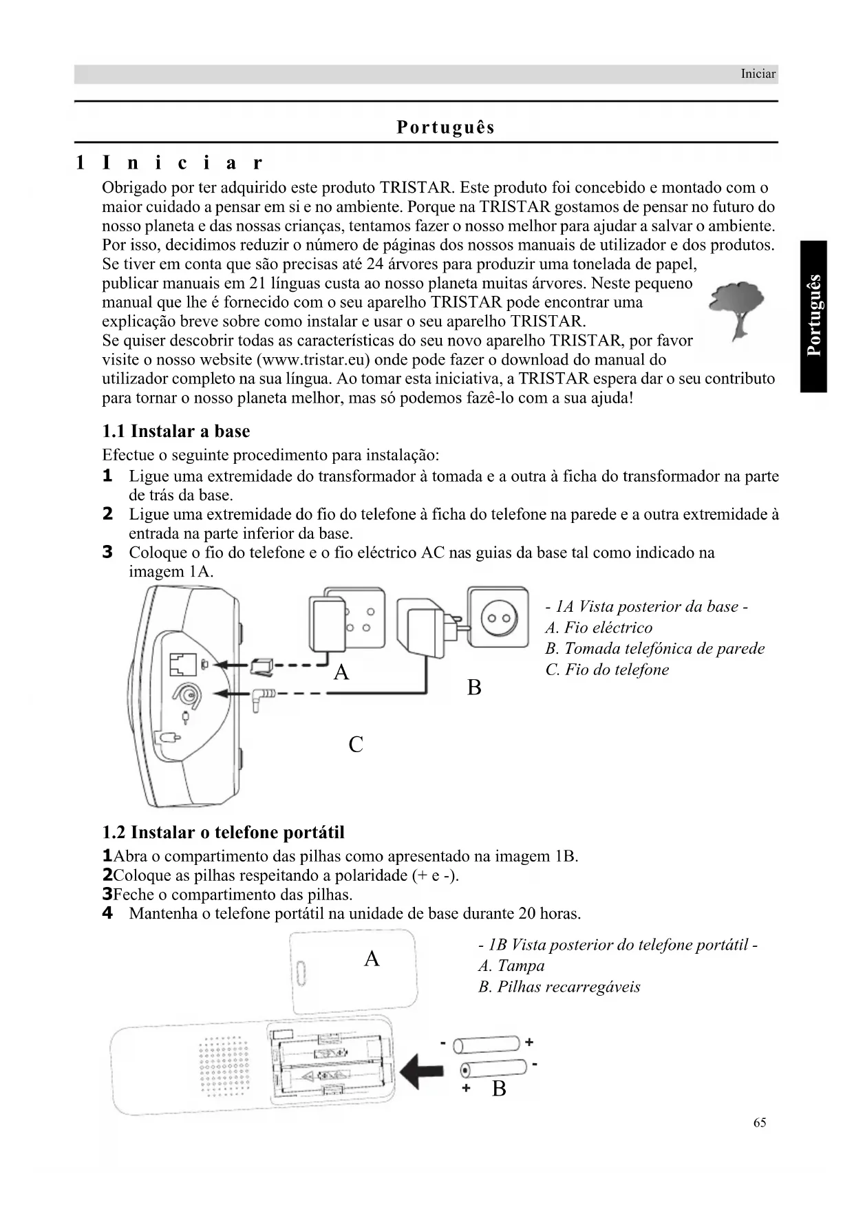 1 Abra o compartimento das pilhas como apresentado na imagem 1B. 2 Coloque as pilhas respeitando a polaridade (+ e -). 3 Feche o compartimento das pilhas. 4 Mantenha o telefone portátil na unidade de base durante 20 horas.