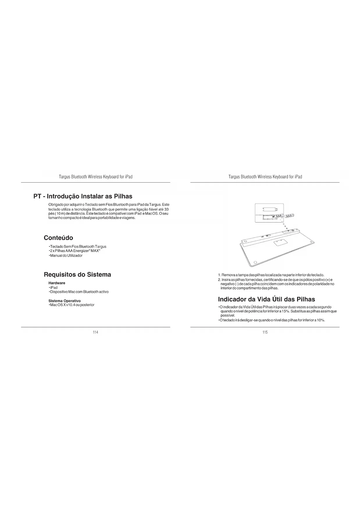 Função Ecrã InicialProcurarO iPad irá entrar no modo Photo FrameMostrar e ocultar o Teclado no seu monitorRetroceder ou ir para a música, lme ou apresentação anteriorAvançar Rapidamente ou ir para a música, lme ou apresen-tação seguinteReproduzir ou colocar músicas, lmes ou apresentações em pausaRetirar o som do iPadDiminuir o som do iPadAumentar o som do iPadBloquear o ecrã Ligação Bluetooth: Mac 1. Aceda ao ícone Bluetooth localizado no seu ambiente de trabalho ou na barra do sistema e clique no ícone para começar a conguração. Seleccione “Ligar Bluetooth” para activar a função Bluetooth no seu Mac.2. Percorra a lista para baixo e seleccione “Congurar Dispositivo Bluetooth...”3. O Assistente de Conguração Bluetooth irá iniciar. Siga as instruções no ecrã.4. Seleccione “teclado” e clique em continuar para proceder com a conguração. O seu teclado terá de estar no modo “pesquisa” para ligar.5. Prima o botão Connect na parte traseira do seu Teclado Bluetooht Sem Fios Targus Bluetooth para entrar no modo de pesquisa. O indicador de pouca carga irá piscar em azul quando o teclado entrar no modo de pesquisa.6. O seu computador irá começar a procurar o teclado. Assim que o teclado for encontrado, irá aparecer na lista. Assinale “Teclado Bluetooth” e prima continuar.7. O teclado Bluetooth irá começar a emparelhar. Clique em continuar para prosseguir.8. Parabéns. O seu teclado Bluetooth está agora congurado e pronto a utilizar. Pode escolher entre congurar outro dispositivo ou clicar em Sair para abandonar a conguração.Targus Bluetooth Wireless Keyboard for iPad