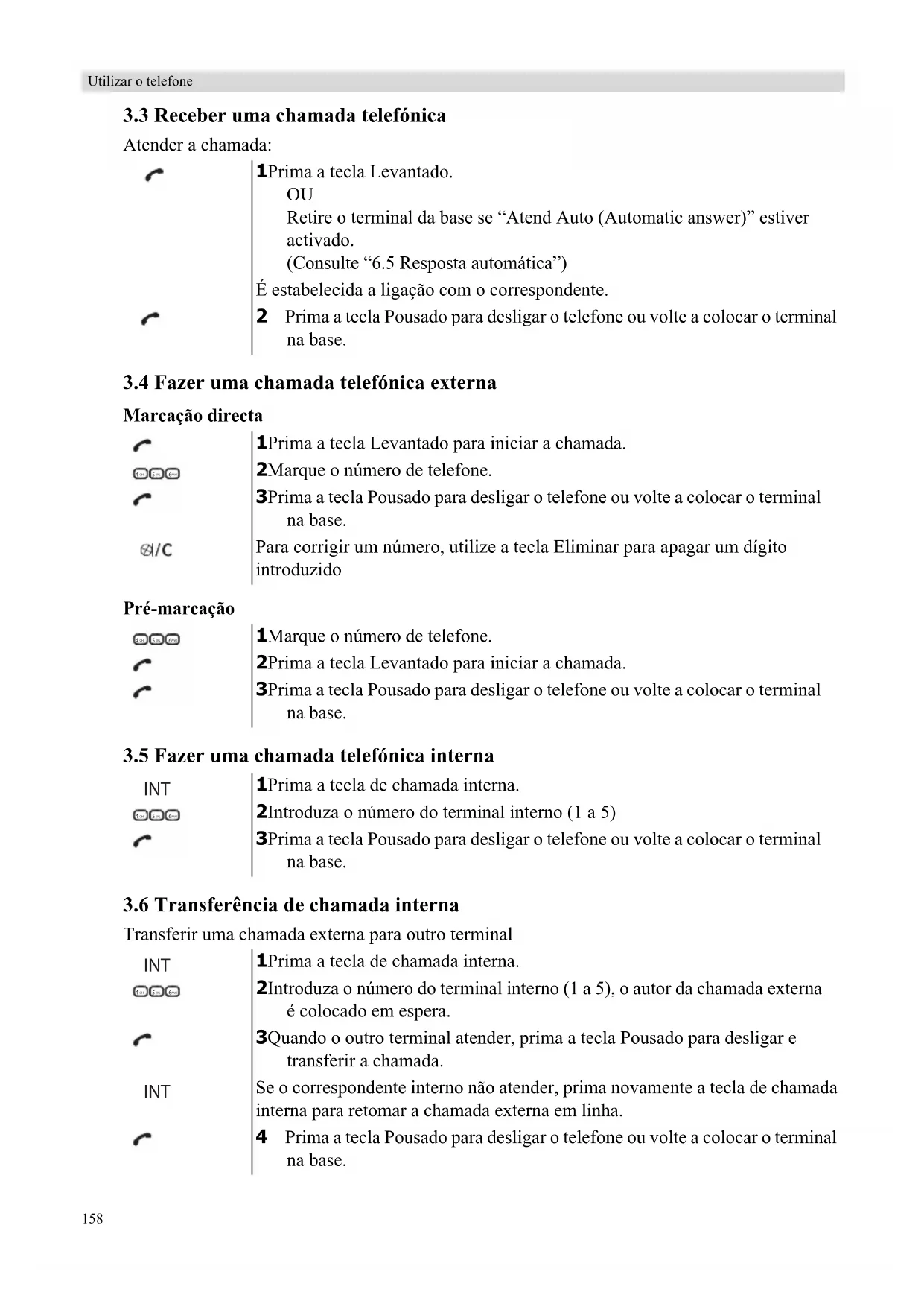 Retire o terminal da base se “Atend Auto (Automatic answer)” estiver activado. (Consulte “6.5 Resposta automática”) É estabelecida a ligação com o correspondente. 2 Prima a tecla Pousado para desligar o telefone ou volte a colocar o terminal na base. 1 Prima a tecla Levantado para iniciar a chamada. 2 Marque o número de telefone. 3 Prima a tecla Pousado para desligar o telefone ou volte a colocar o terminal na base. Para corrigir um número, utilize a tecla Eliminar para apagar um dígito introduzido 1 Marque o número de telefone. 2 Prima a tecla Levantado para iniciar a chamada. 3 Prima a tecla Pousado para desligar o telefone ou volte a colocar o terminal na base. 1 Prima a tecla de chamada interna. 2 Introduza o número do terminal interno (1 a 5) 3 Prima a tecla Pousado para desligar o telefone ou volte a colocar o terminal na base. 1 Prima a tecla de chamada interna. 2 Introduza o número do terminal interno (1 a 5), o autor da chamada externa é colocado em espera. 3 Quando o outro terminal atender, prima a tecla Pousado para desligar e transferir a chamada. Se o correspondente interno não atender, prima novamente a tecla de chamada interna para retomar a chamada externa em linha. 4 Prima a tecla Pousado para desligar o telefone ou volte a colocar o terminal na base.