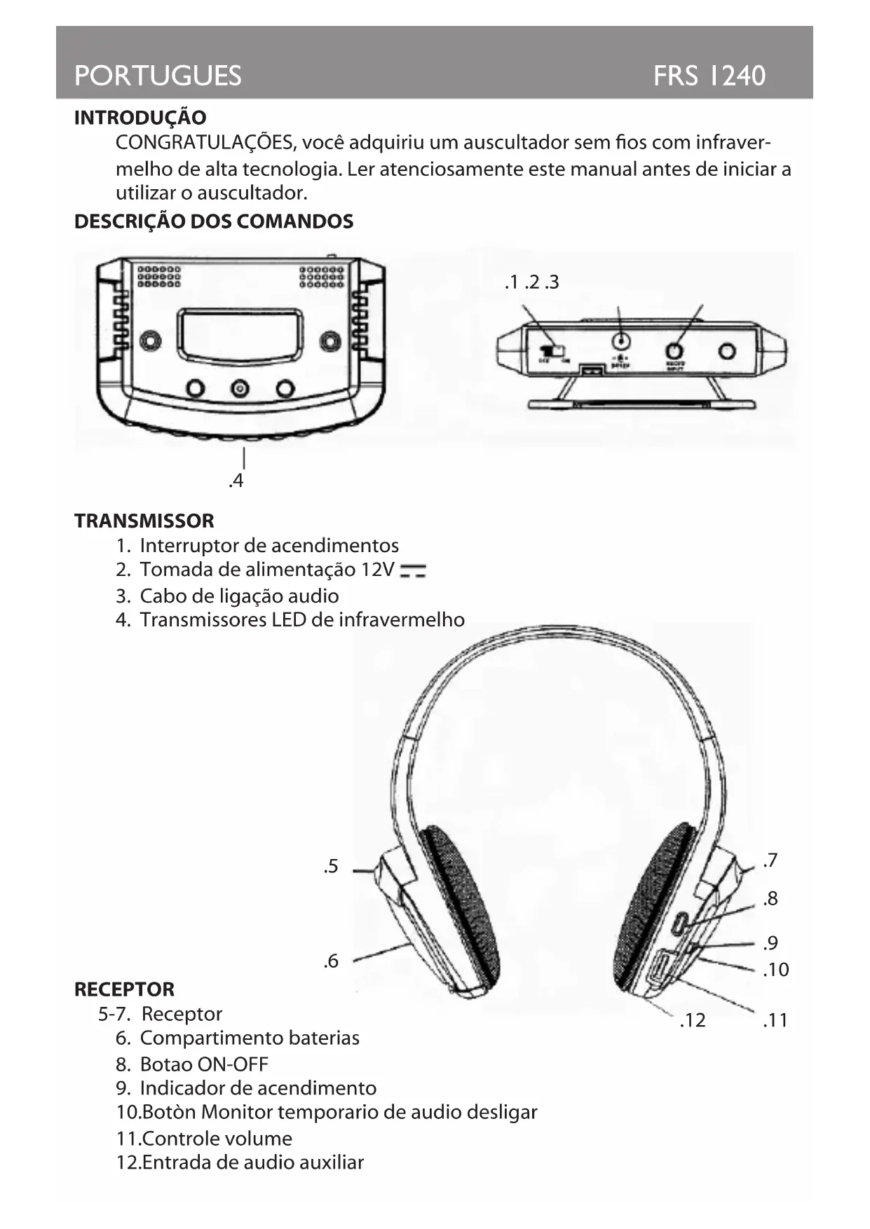 Tipo de transmissor: ...................................Estereofónico Sistema de transmissão: ............................Modulação de raios infra vermelho Frequência de transmissão: .....................2.3MHz para o canal esquerdo 2.8MHz para o canal direito Resposta de frequência .............................30-20.000 Hz Relação S/R: ....................................................75 dB Distorsão: ........................................................< 1% Separação canais: ........................................> 40 dB Consumo transmissor: ...............................1,2 W Modo de consumo OFF: ............................< 1 W Alimentação transmissor: .........................12V 100mA com adaptador 1,2W para 230V ~ 50Hz Alimentação receptor ................................2 baterias formato “AAA” Peso auscultador: .........................................120g PRECAUÇÕES PARA O CORRETO DESCARTE DO PRODUTO. O símbolo apresentado no equipamento indica que os resíduos devem ser descartados em “coleta seletiva” e, portanto, o produto não deve ser descar- tado junto com o lixo urbano. O usuário deve levar o produto a “centros de coleta seletiva” especiais fornecidos pelo governo local ou entregá-lo ao revendedor contra a compra de um novo produto. A recolha selectiva de resíduos e as operações subsequentes de tratamento, reciclagem e eliminação promovem a produção de equipamentos com materiais reciclados e limitam os efeitos negativos no ambiente e na saúde causados pelo tratamento inadequado de resíduos. O descarte irregular do produto acarreta a aplicação de penalidades admi- nistrativas. PORTUGUESFRS 1240