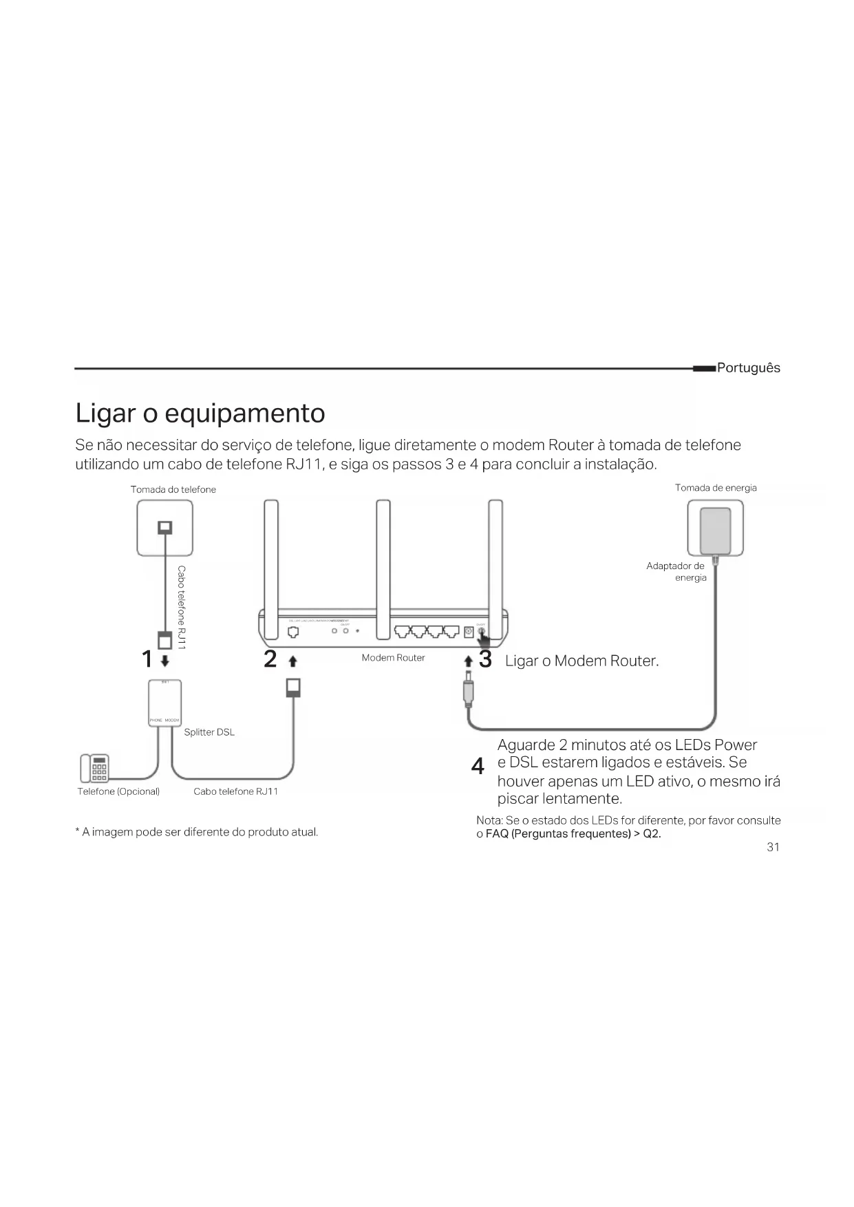 piscar lentamente. Tomada do telefoneCabo telefone RJ11Modem Router Ligar o Modem Router. Tomada de energiaSplitter DSL Telefone (Opcional)Cabo telefone RJ11Adaptador de energiaPortuguês
