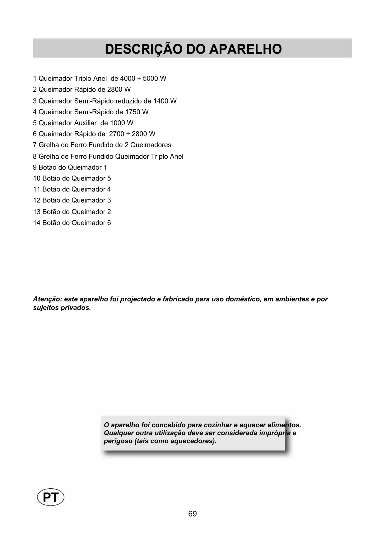 Atenção: este aparelho foi projectado e fabricado para uso doméstico, em ambientes e por