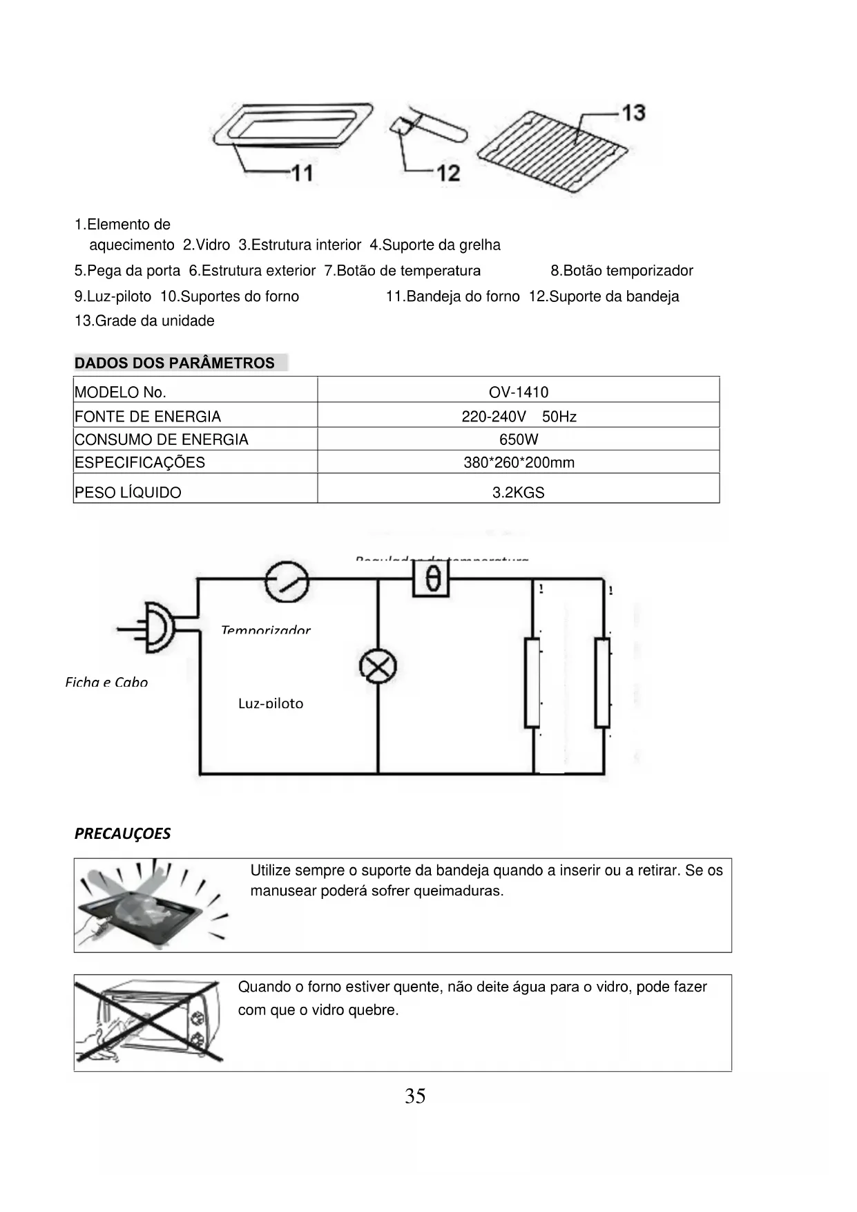 PRECAUÇOES Utilize sempre o suporte da bandeja quando a inserir ou a retirar. Se os manusear poderá sofrer queimaduras. Quando o forno estiver quente, não deite água para o vidro, pode fazer com que o vidro quebre. MODELO No. OV-1410 FONTE DE ENERGIA 220-240V 50Hz