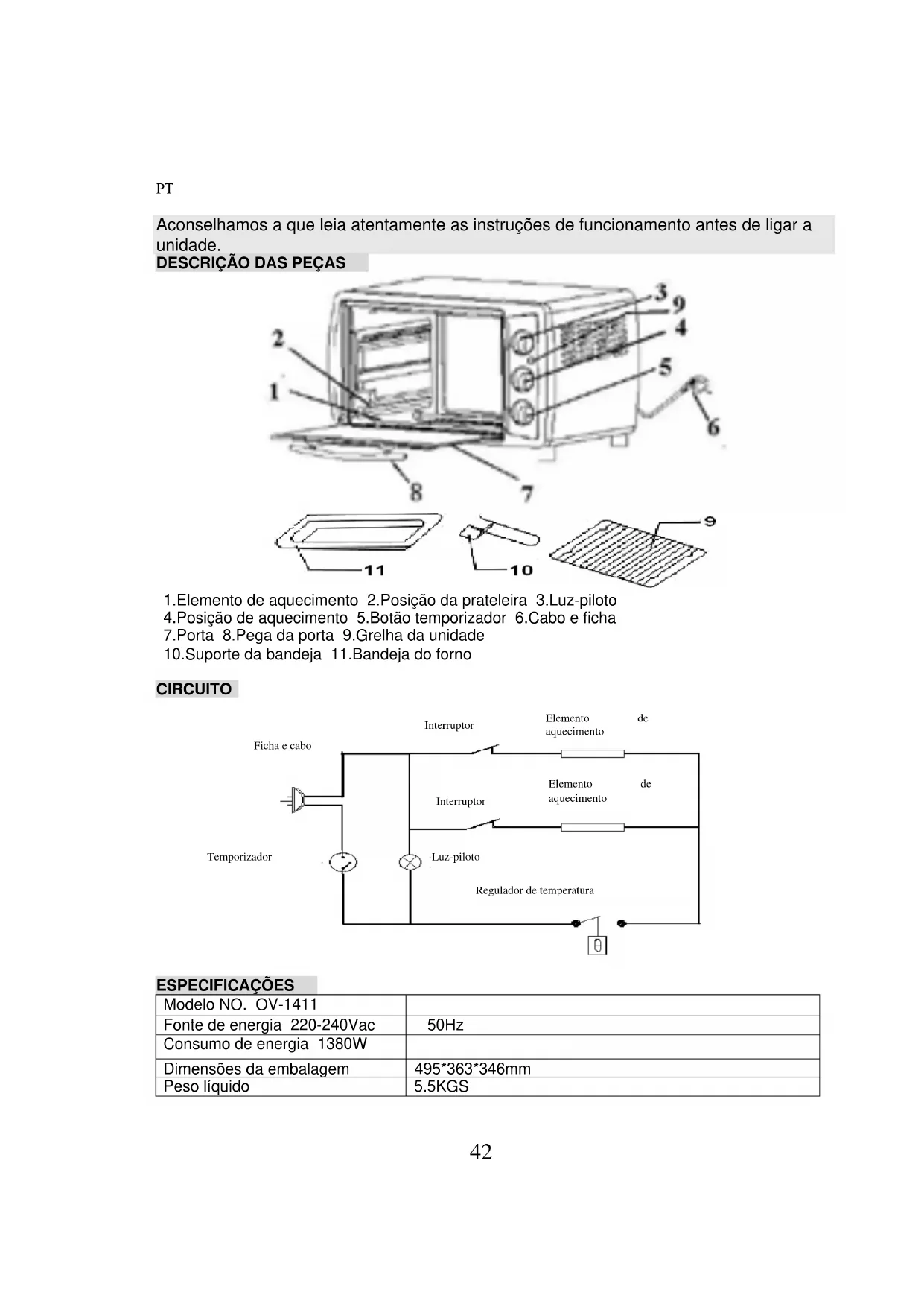 ESPECIFICAÇÕES Modelo NO. OV-1411 Fonte de energia 220-240Vac 50Hz Consumo de energia 1380W Dimensões da embalagem 495*363*346mm Peso líquido 5.5KGS Ficha e cabo Interruptor Interruptor Temporizador Luz-piloto Regulador de temperatura Elemento de aquecimento Elemento de aquecimento43 PRECAUÇOES Indicações especiais: A imagem do acessório varia segundo os diferentes modelos. Consulte o modelo que comprou recentemente.
