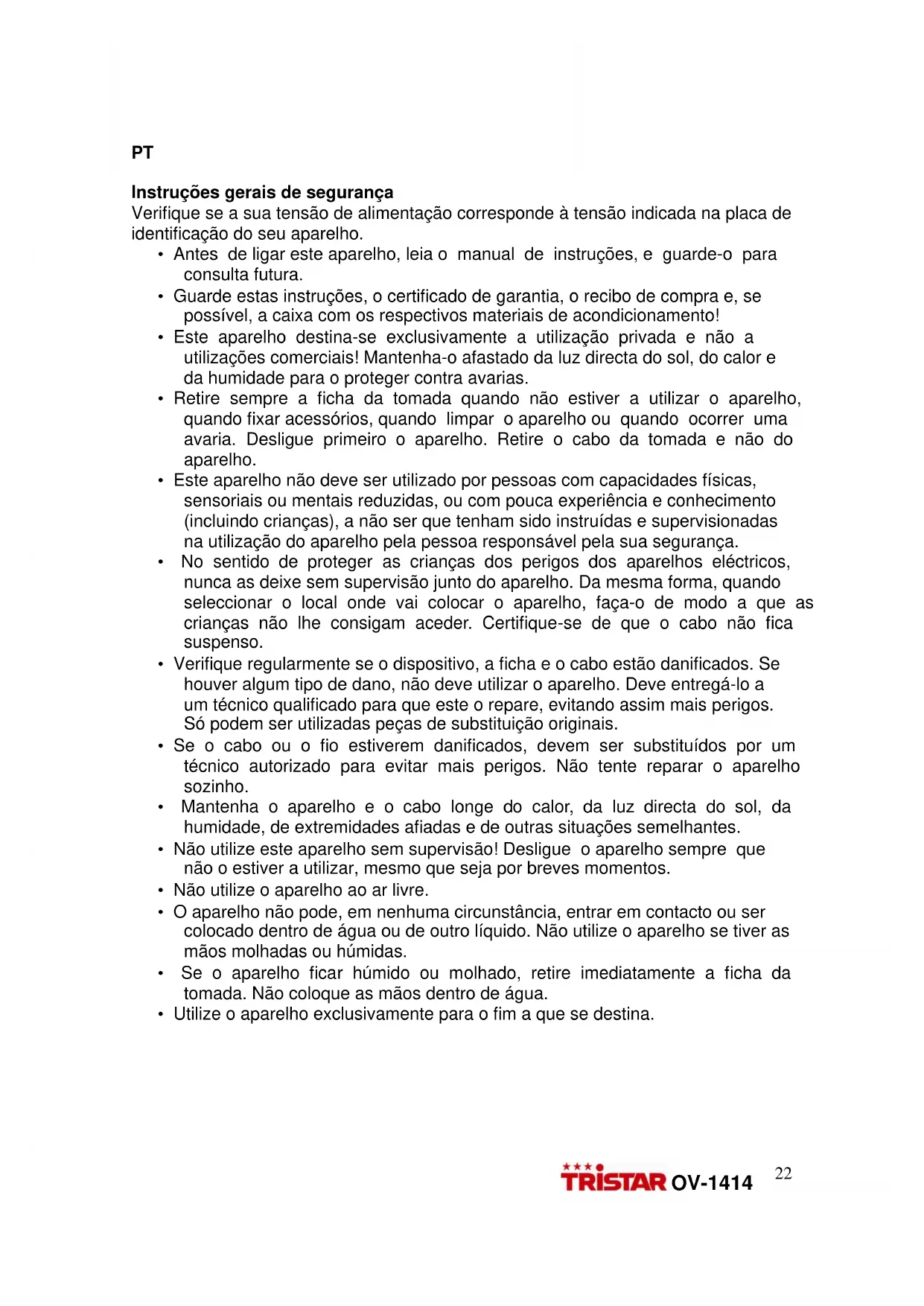 Encontre gratuitamente o manual do aparelho OV1414 TRISTAR em formato PDF.