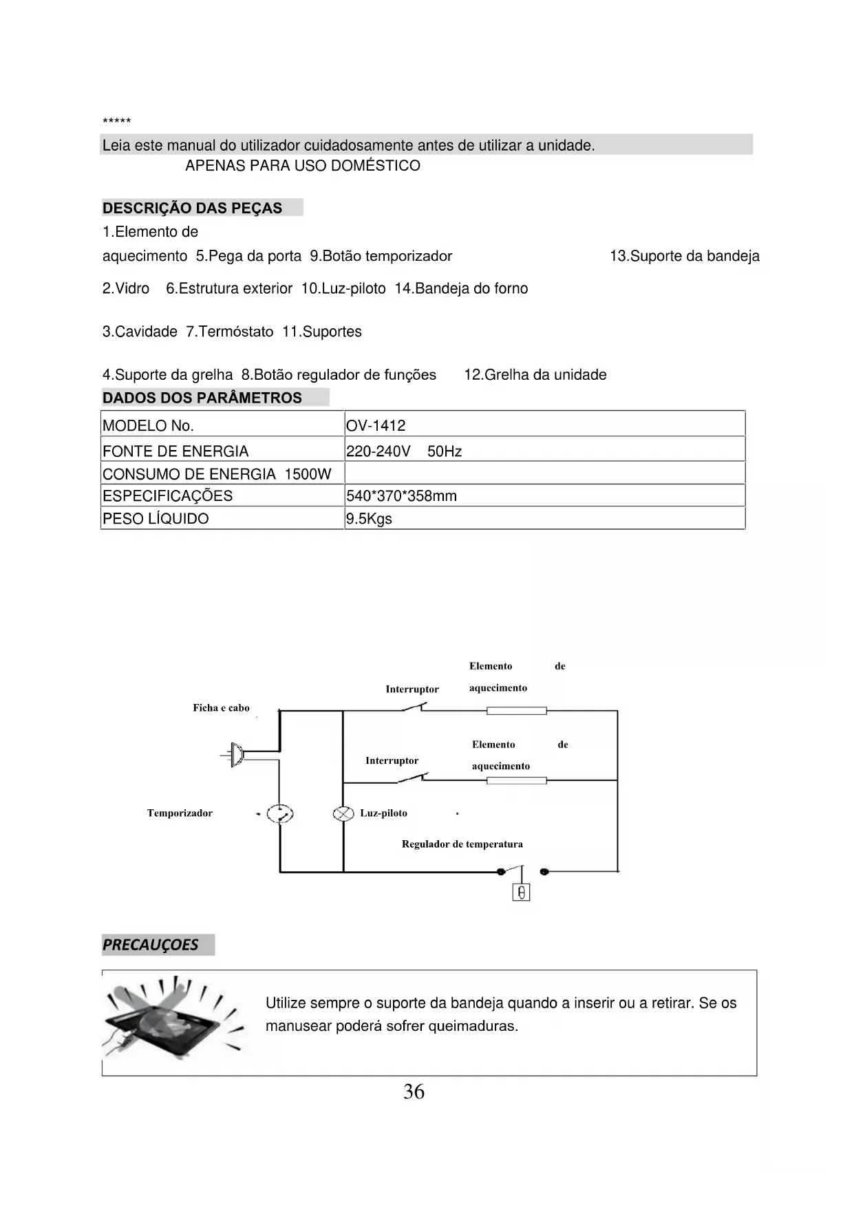 PRECAUÇOES Utilize sempre o suporte da bandeja quando a inserir ou a retirar. Se os manusear poderá sofrer queimaduras. MODELO No. OV-1412 FONTE DE ENERGIA 220-240V 50Hz