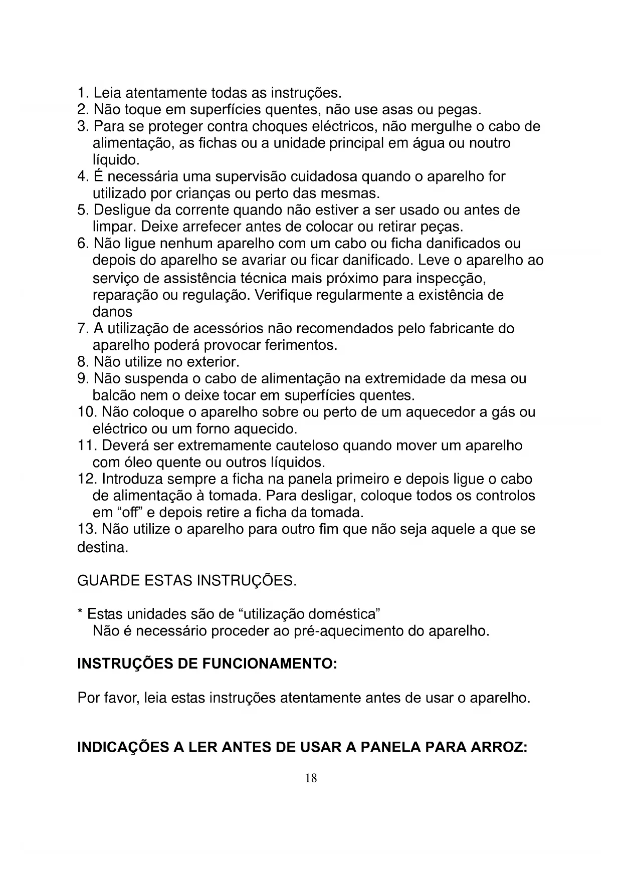 - Estas unidades são de “utilização doméstica” Não é necessário proceder ao pré-aquecimento do aparelho. INSTRUÇÕES DE FUNCIONAMENTO: Por favor, leia estas instruções atentamente antes de usar o aparelho.
