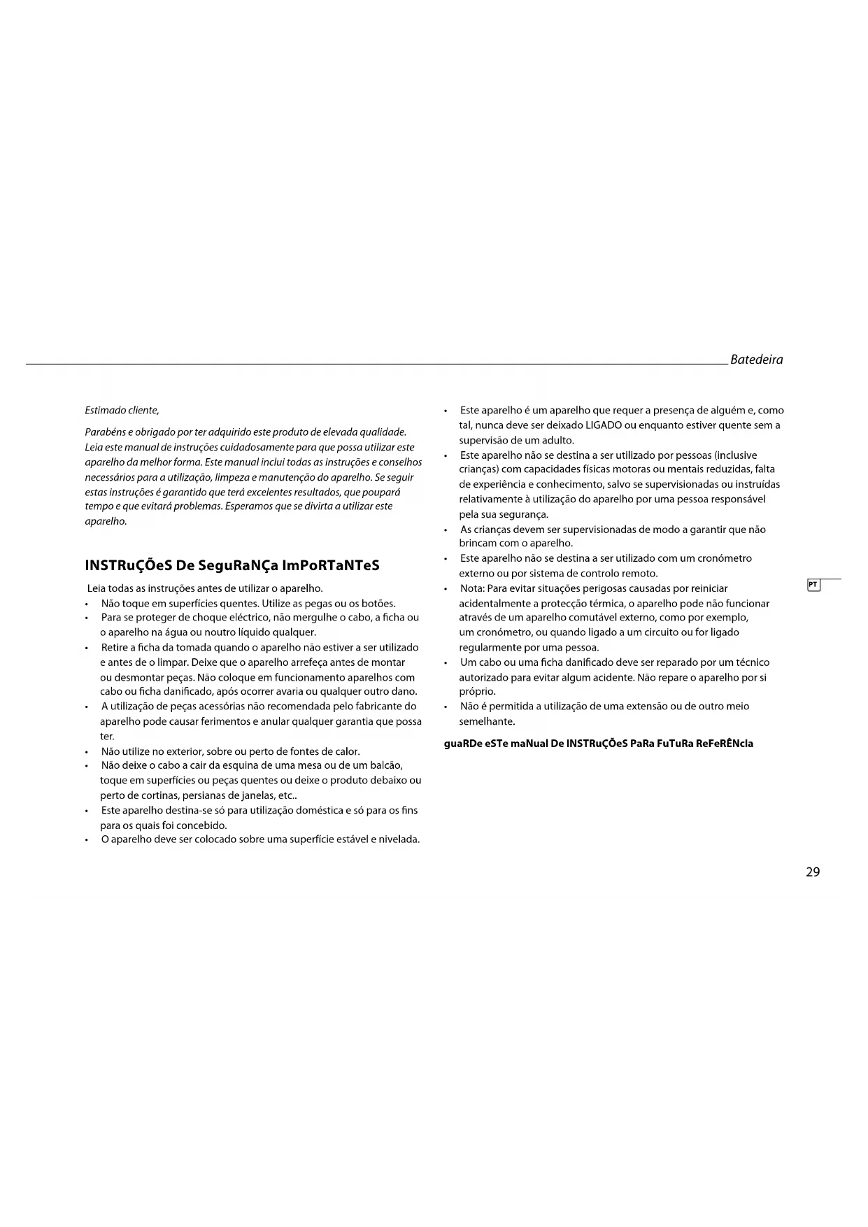 - Não é permitida a utilização de uma extensão ou de outro meio semelhante. guaRDe eSTe maNual De INSTRuÇÕeS PaRa FuTuRa ReFeRÊNcIa Batedeira1