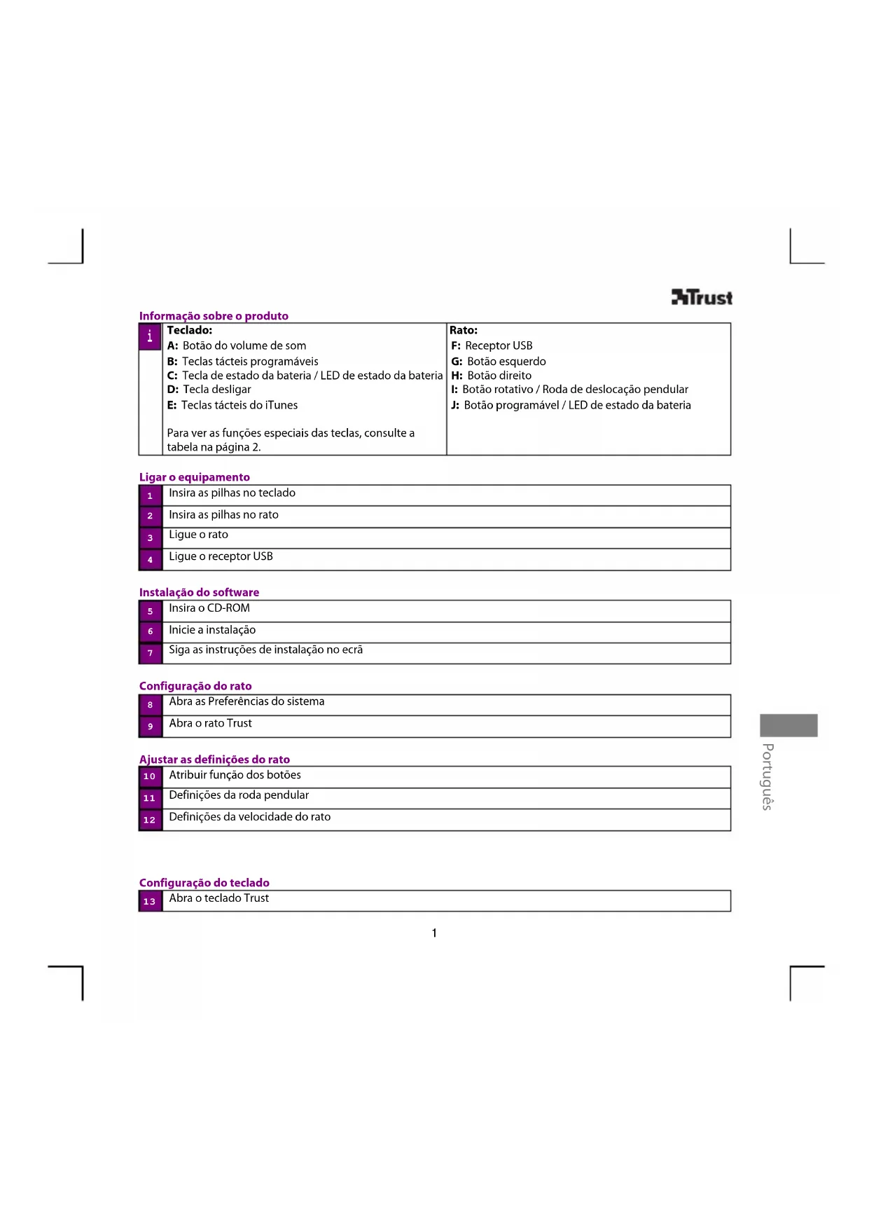 Informação sobre o produto Teclado: A: Botão do volume de som B: Teclas tácteis programáveis C: Tecla de estado da bateria / LED de estado da bateria D: Tecla desligar E: Teclas tácteis do iTunes Para ver as funções especiais das teclas, consulte a tabela na página 2. Rato: F: Receptor USB G: Botão esquerdo H: Botão direito I: Botão rotativo / Roda de deslocação pendular J: Botão programável / LED de estado da bateria Ligar o equipamento Insira as pilhas no teclado Insira as pilhas no rato Ligue o rato Ligue o receptor USB Instalação do software Insira o CD-ROM Inicie a instalação Siga as instruções de instalação no ecrã Configuração do rato Abra as Preferências do sistema Abra o rato Trust Ajustar as definições do rato Atribuir função dos botões Definições da roda pendular Definições da velocidade do rato