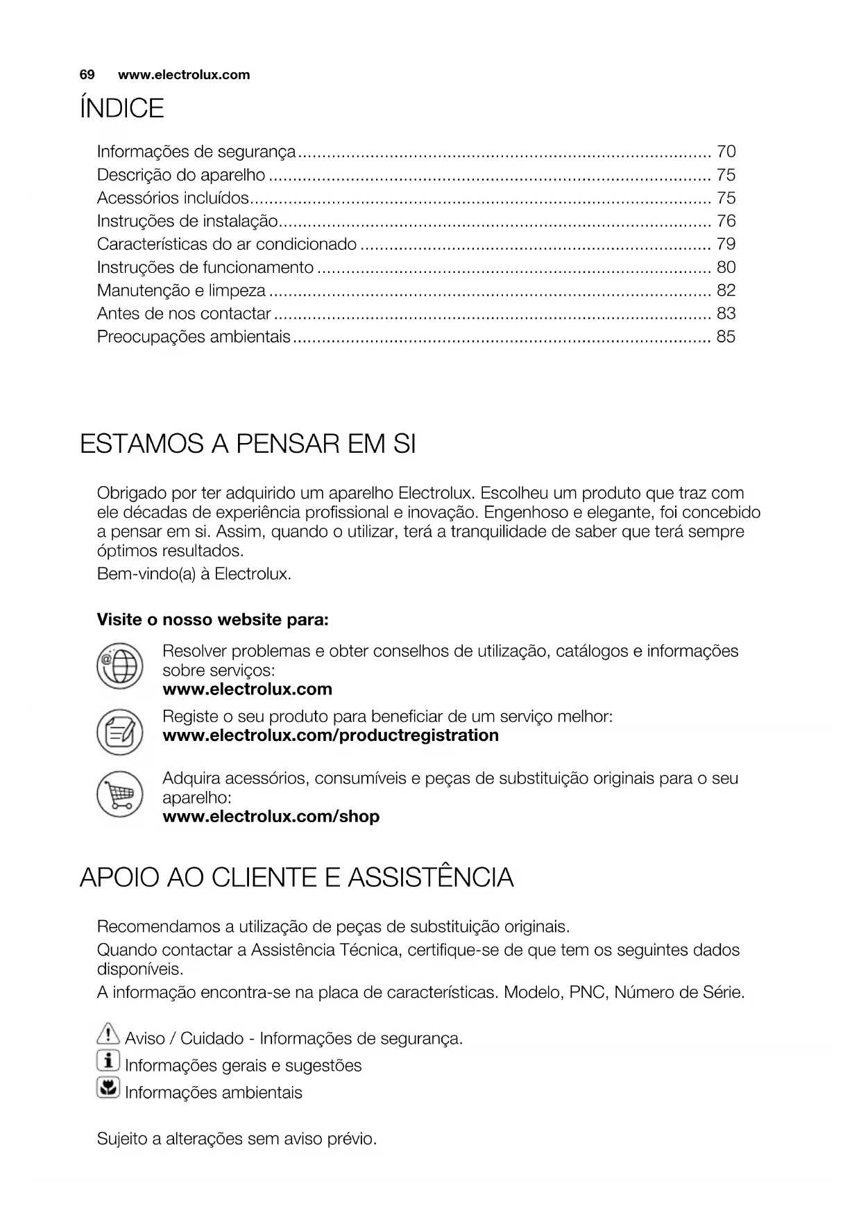 ÍNDICE ESTAMOS A PENSAR EM SI Obrigado por ter adquirido um aparelho Electrolux. Escolheu um produto que traz com