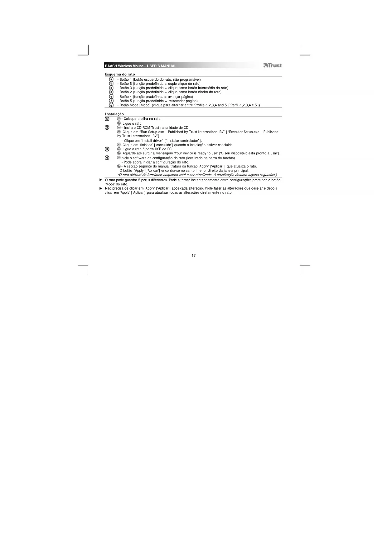 Baixe as instruções para o seu Rato em formato PDF gratuitamente! Encontre o seu manual Daash - TRUST e retome o controlo do seu dispositivo eletrónico. Nesta página estão publicados todos os documentos necessários para a utilização do seu dispositivo. Daash da marca TRUST.