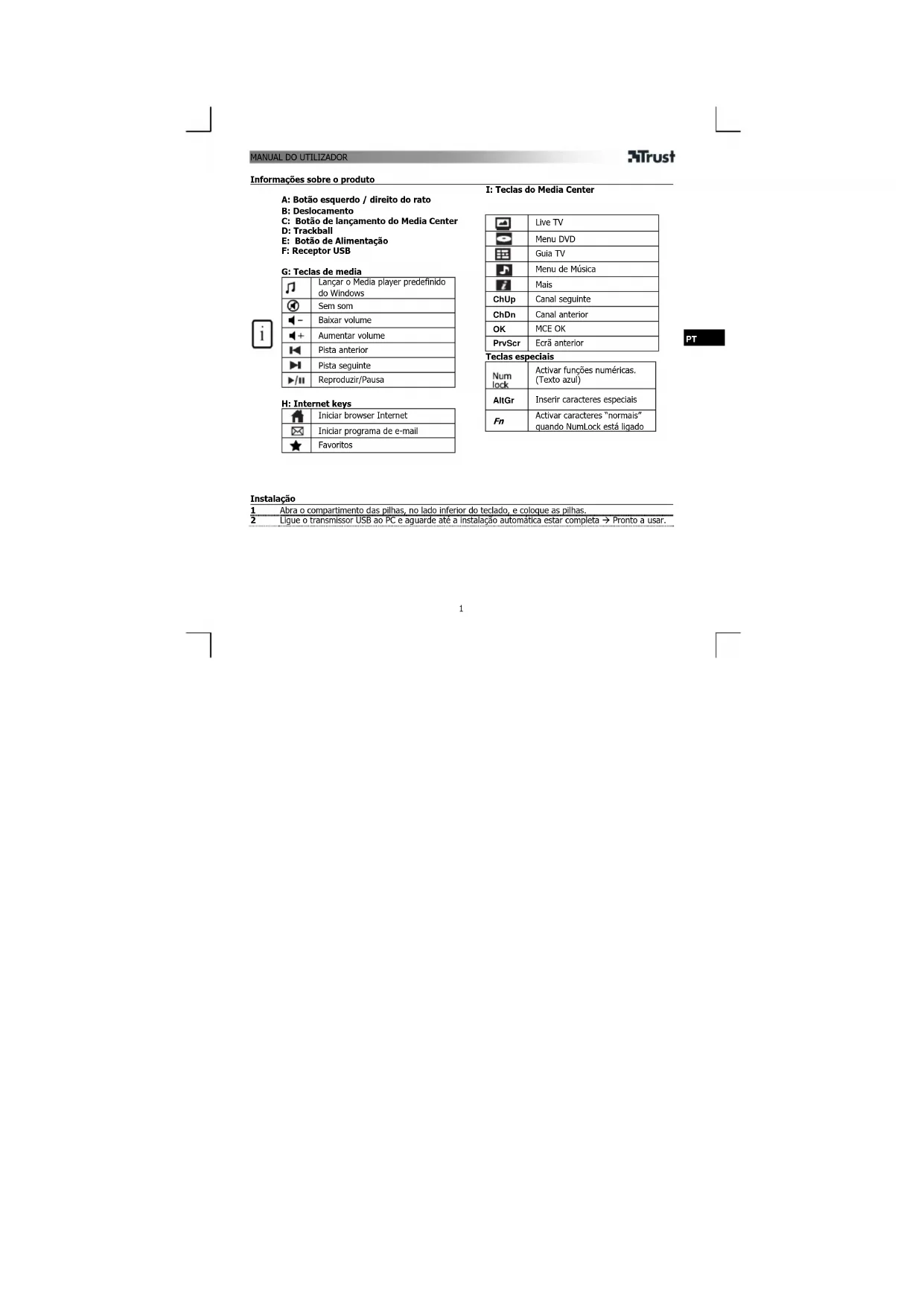 MCE OK PrvScr Ecrã anterior Instalação 1 Abra o compartimento das pilhas, no lado inferior do teclado, e coloque as pilhas. 2 Ligue o transmissor USB ao PC e aguarde até a instalação automática estar completa Pronto a usar.MANUAL DO UTILIZADOR
