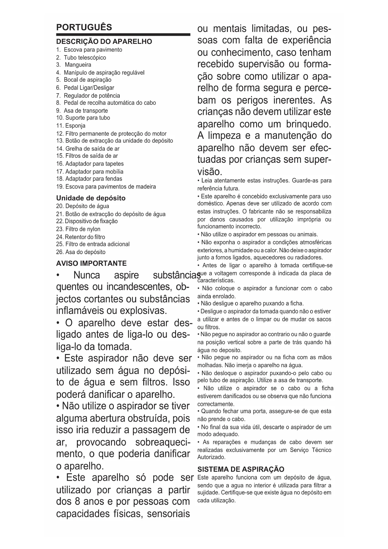 SISTEMA DE ASPIRAÇÃO Este aparelho funciona com um depósito de água,
