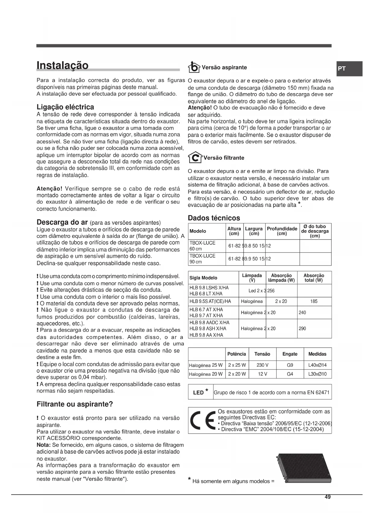 Instalação Para a instalação correcta do produto, ver as figuras disponíveis nas primeiras páginas deste manual. A instalação deve ser efectuada por pessoal qualicado. Ligação eléctrica A tensão de rede deve corresponder à tensão indicada na etiqueta de características situada dentro do exaustor. Se tiver uma cha, ligue o exaustor a uma tomada com conformidade com as normas em vigor, situada numa zona acessível. Se não tiver uma cha (ligação directa à rede), ou se a cha não puder ser colocada numa zona acessível, aplique um interruptor bipolar de acordo com as normas que assegure a desconexão total da rede nas condições da categoria de sobretensão III, em conformidade com as regras de instalação. Atenção! Verifique sempre se o cabo de rede está montado correctamente antes de voltar a ligar o circuito do exaustor à alimentação de rede e de vericar o seu correcto funcionamento. Descarga do ar (para as versões aspirantes) Ligue o exaustor a tubos e orifícios de descarga de parede com diâmetro equivalente à saída do ar (ange de união). A utilização de tubos e orifícios de descarga de parede com diâmetro inferior implica uma diminuição das performances de aspiração e um sensível aumento do ruído. Declina-se qualquer responsabilidade neste caso. ! Use uma conduta com o comprimento mínimo indispensável. ! Use uma conduta com o menor número de curvas possível. ! Evite alterações drásticas de secção da conduta. ! Use uma conduta com o interior o mais liso possível. ! O material da conduta deve ser aprovado pelas normas, ! Não ligue o exaustor a condutas de descarga de fumos produzidos por combustão (caldeiras, lareiras, aquecedores, etc.). ! Para a descarga do ar a evacuar, respeite as indicações das autoridades competentes. Além disso, o ar a descarregar não deve ser eliminado através de uma cavidade na parede a menos que esta cavidade não se destine a este m. ! Equipe o local com condutas de admissão para evitar que o exaustor crie uma pressão negativa na divisão (que não deve superar os 0,04 mbar). ! A empresa declina qualquer responsabilidade caso estas normas não sejam respeitadas. Filtrante ou aspirante? ! O exaustor está pronto para ser utilizado na versão aspirante. Para utilizar o exaustor na versão ltrante, deve instalar o KIT ACESSÓRIO correspondente. Nota: Se fornecido, em alguns casos, o sistema de ltragem adicional à base de carvões activos pode já estar instalado no exaustor. As informações para a transformação do exaustor em versão aspirante para a versão ltrante estão presentes neste manual (ver "Versão ltrante"). Versão aspirante O exaustor depura o ar e expele-o para o exterior através de uma conduta de descarga (diâmetro 150 mm) xada na ange de união. O diâmetro do tubo de descarga deve ser equivalente ao diâmetro do anel de ligação. Atenção! O tubo de evacuação não é fornecido e deve ser adquirido. Na parte horizontal, o tubo deve ter uma ligeira inclinação para cima (cerca de 10°) de forma a poder transportar o ar para o exterior mais facilmente. Se o exaustor dispuser de ltros de carvão, estes devem ser retirados. Versão ltrante O exaustor depura o ar e emite ar limpo na divisão. Para utilizar o exaustor nesta versão, é necessário instalar um sistema de ltração adicional, à base de carvões activos. Para esta versão, é necessário um deector de ar, redução e ltro(s) de carvão. O tubo superior deve ter abas de evacuação de ar posicionadas na parte alta *. Dados técnicos ModeloAltura (cm) Largura (cm) Profundidade (cm) Ø do tubo de descarga (cm) TBOX-LUCE 60 cm61-82 59.8 50 15/12TBOX-LUCE 90 cm61-82 89.9 50 15/12Sigla ModeloLâmpada (V) Absorção lâmpada (W)Absorção total (W)HLB 9.8 LSHS X/HAHLB 6.8 LT X/HALed 2 x 3 256 HLB 9.5S AT(ICE)/HA Halogénea 2 x 20 185 HLB 6.7 AT X/HAHLB 9.7 AT X/HAHalogénea 2 x 20 240HLB 9.8 AADC X/HAHLB 9.8 ASH X/HAHLB 9.8 AA X/HAHalogénea 2 x 20 290Potência Tensão Engate MedidasHalogénea 25 W 2 x 25 W 230 V G9 L40xØ14 Halogénea 20 W 2 x 20 W 12 V G4 L30xØ10 LED *Grupo de risco 1 de acordo com a norma EN 62471 Os exaustores estão em conformidade com as seguintes Directivas EC: