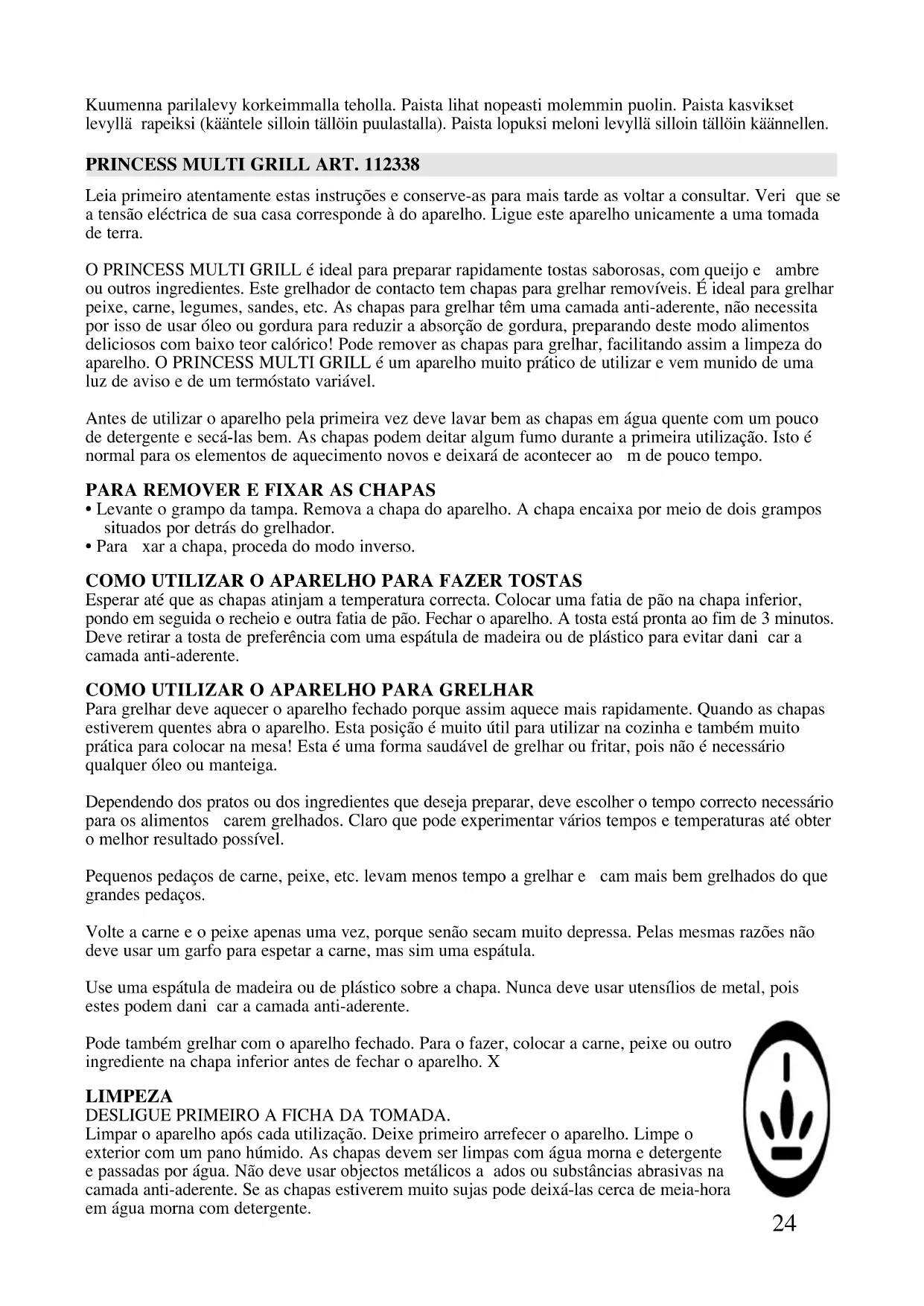 Para grelhar deve aquecer o aparelho fechado porque assim aquece mais rapidamente. Quando as chapas estiverem quentes abra o aparelho. Esta posição é muito útil para utilizar na cozinha e também muito prática para colocar na mesa! Esta é uma forma saudável de grelhar ou fritar, pois não é necessário qualquer óleo ou manteiga. Dependendo dos pratos ou dos ingredientes que deseja preparar, deve escolher o tempo correcto necessário para os alimentos ficarem grelhados. Claro que pode experimentar vários tempos e temperaturas até obter o melhor resultado possível. Pequenos pedaços de carne, peixe, etc. levam menos tempo a grelhar e ficam mais bem grelhados do que grandes pedaços. Volte a carne e o peixe apenas uma vez, porque senão secam muito depressa. Pelas mesmas razões não deve usar um garfo para espetar a carne, mas sim uma espátula. Use uma espátula de madeira ou de plástico sobre a chapa. Nunca deve usar utensílios de metal, pois estes podem danificar a camada anti-aderente. Pode também grelhar com o aparelho fechado. Para o fazer, colocar a carne, peixe ou outro ingrediente na chapa inferior antes de fechar o aparelho. X LIMPEZA DESLIGUE PRIMEIRO A FICHA DA TOMADA. Limpar o aparelho após cada utilização. Deixe primeiro arrefecer o aparelho. Limpe o exterior com um pano húmido. As chapas devem ser limpas com água morna e detergente e passadas por água. Não deve usar objectos metálicos afiados ou substâncias abrasivas na camada anti-aderente. Se as chapas estiverem muito sujas pode deixá-las cerca de meia-hora em água morna com detergente.25 Depois de grelhar, basta limpar as chapas com papel de cozinha enquanto o aparelho estiver ainda quente. A GARANTIA NÃO ABRANGE AS CHAPAS QUE TENHAM SIDO DANIFICADAS POR OBJECTOS AFIADOS!