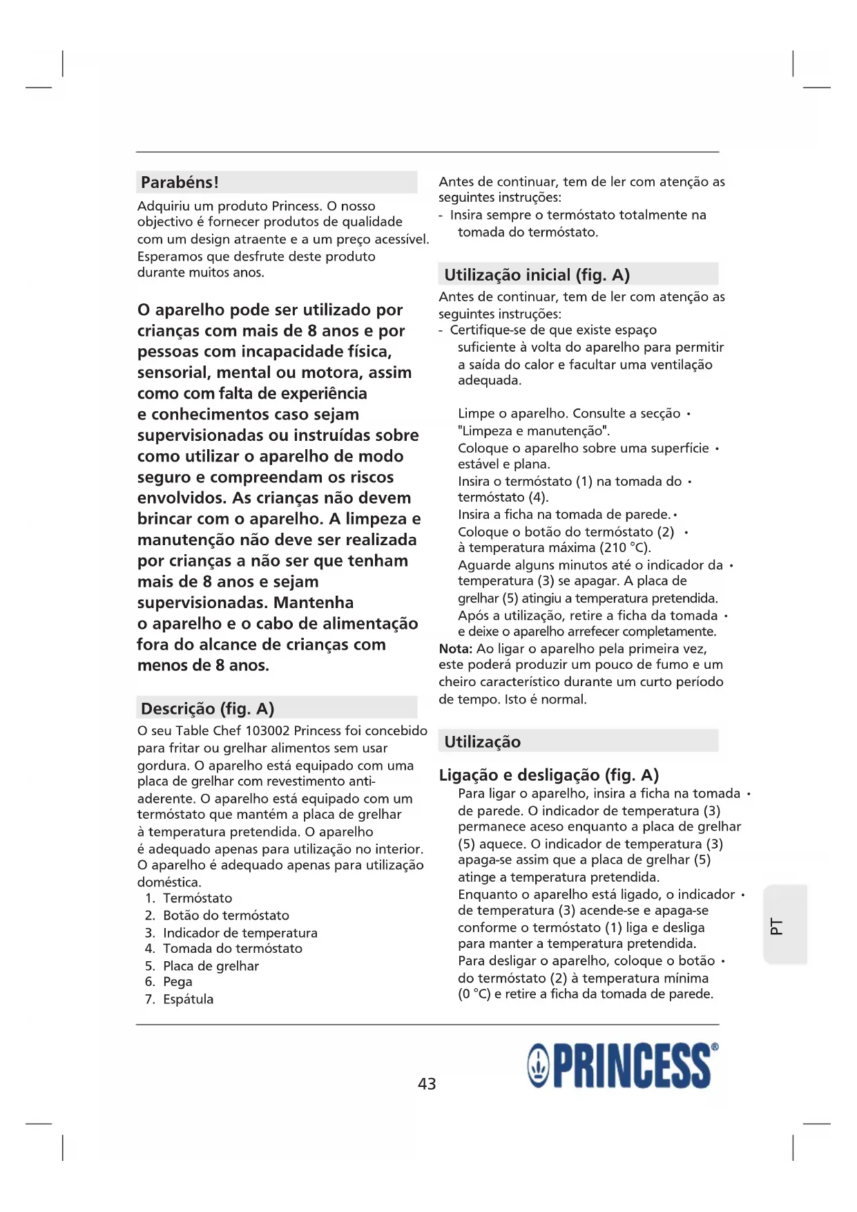 Parabéns! Adquiriu um produto Princess. O nosso objectivo é fornecer produtos de qualidade com um design atraente e a um preço acessível. Esperamos que desfrute deste produto durante muitos anos. O aparelho pode ser utilizado por crianças com mais de 8 anos e por pessoas com incapacidade física, sensorial, mental ou motora, assim como com falta de experiência e conhecimentos caso sejam supervisionadas ou instruídas sobre como utilizar o aparelho de modo seguro e compreendam os riscos envolvidos. As crianças não devem brincar com o aparelho. A limpeza e manutenção não deve ser realizada por crianças a não ser que tenham mais de 8 anos e sejam supervisionadas. Mantenha o aparelho e o cabo de alimentação fora do alcance de crianças com menos de 8 anos. Descrição (fig. A) O seu Table Chef 103002 Princess foi concebido para fritar ou grelhar alimentos sem usar gordura. O aparelho está equipado com uma placa de grelhar com revestimento anti- aderente. O aparelho está equipado com um termóstato que mantém a placa de grelhar à temperatura pretendida. O aparelho é adequado apenas para utilização no interior. O aparelho é adequado apenas para utilização doméstica.