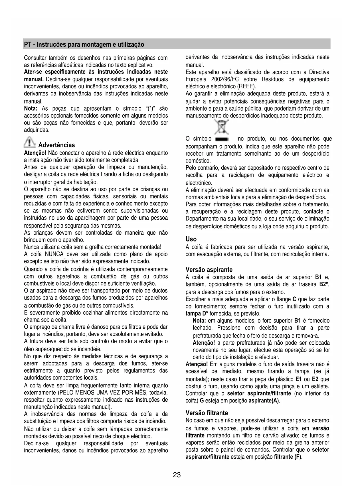 Nunca utilizar a coifa sem a grelha correctamente montada!