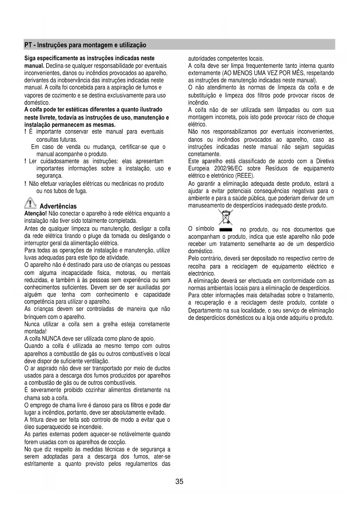 manual. A coifa foi concebida para a aspiração de fumos e