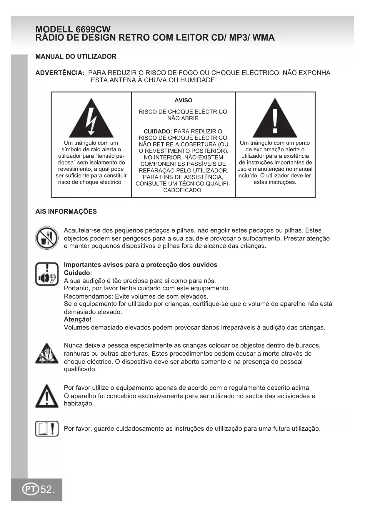 Nunca deixe a pessoa especialmente as crianças colocar os objectos dentro de buracos, ranhuras ou outras abertas. Estes procedimentos podem causar a morte atraves deCHOque electrico. O dispositivo deve ser aberto somente e na presence do pessoal qualificado.