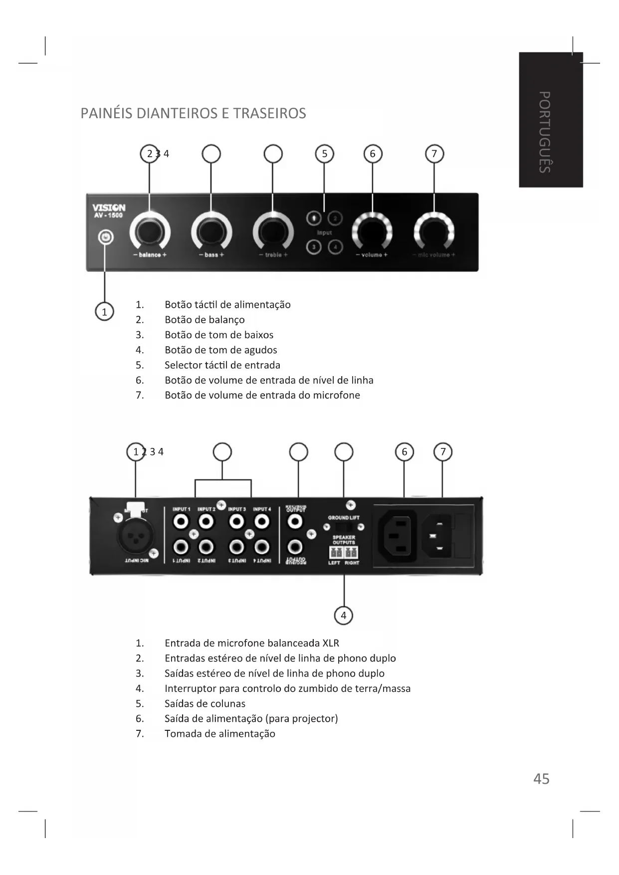 VISION AV - 1500 - balance + - bass + - treble + - volume + - mic volume + 1 2 3 4 5 6 7 1. Botão táctil de alimentação 2. Botão de balanco- Botão táctil de alimentação