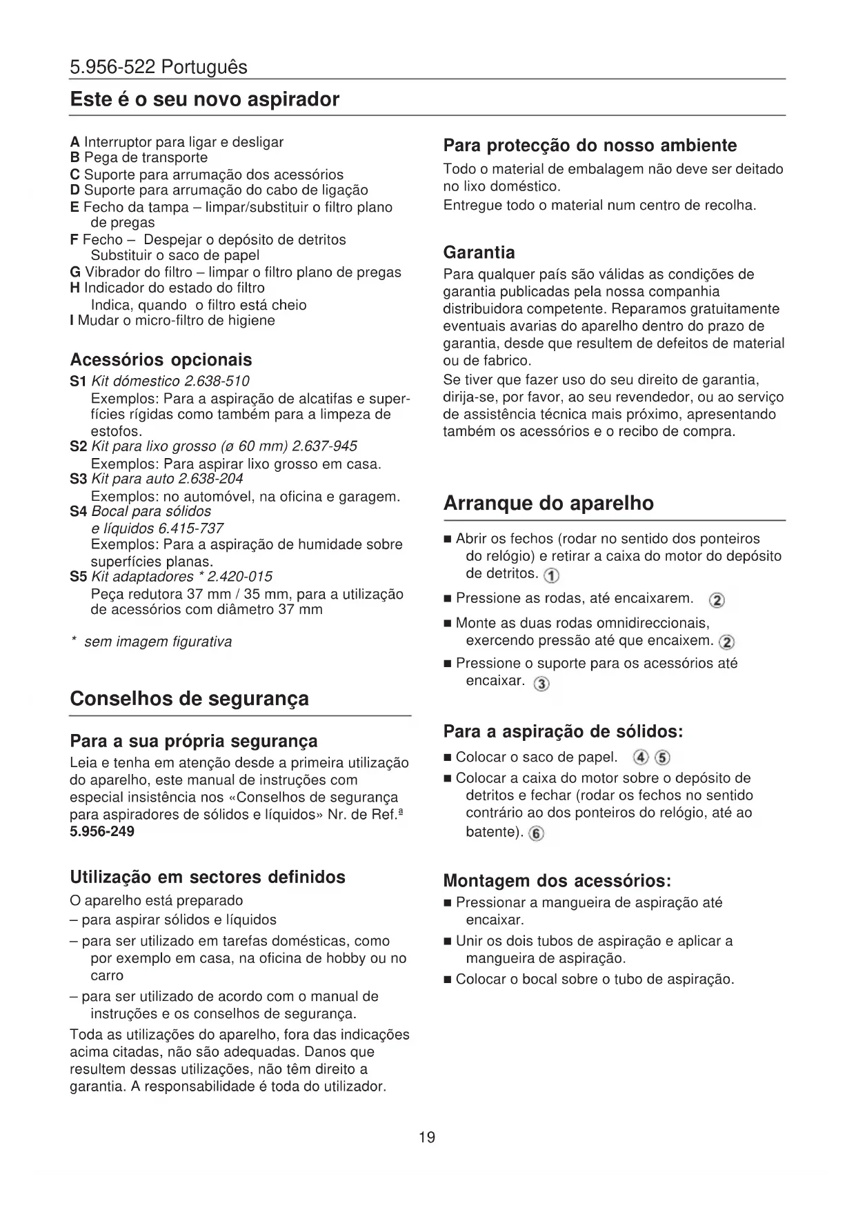 Leia e tenha em atenção desde a primeira utilização do aparelho, este manual de instruções com especial insistência nos «Conselhos de segurança para aspiradores de sólidos e líquidos» Nr. de Ref. ^a 5.956-249