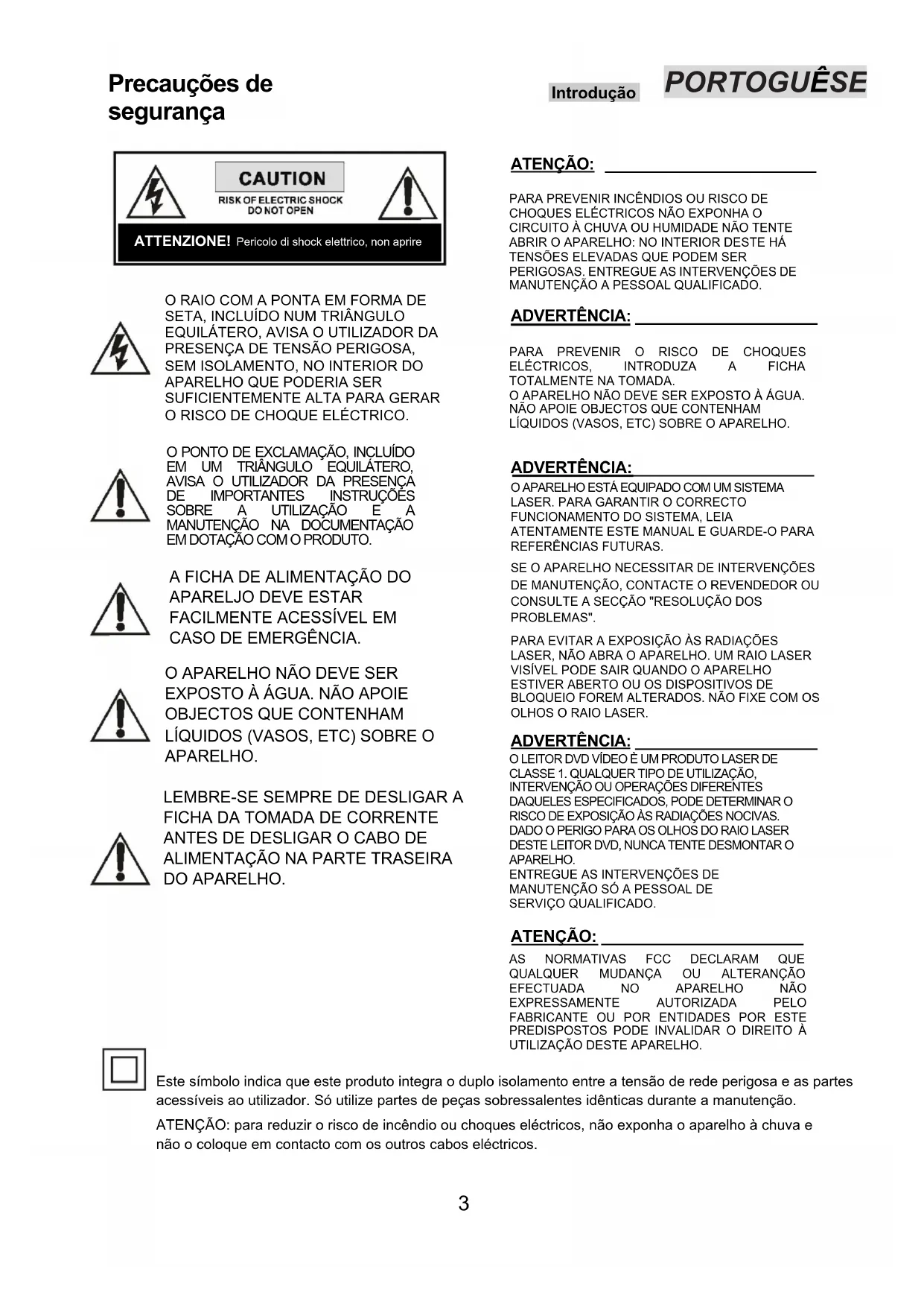 DO APARELHO. ATENÇÃO: _______________________ PARA PREVENIR INCÊNDIOS OU RISCO DE CHOQUES ELÉCTRICOS NÃO EXPONHA O CIRCUITO À CHUVA OU HUMIDADE NÃO TENTE ABRIR O APARELHO: NO INTERIOR DESTE HÁ TENSÕES ELEVADAS QUE PODEM SER PERIGOSAS. ENTREGUE AS INTERVENÇÕES DE MANUTENÇÃO A PESSOAL QUALIFICADO. ADVERTÊNCIA: ____________________ PARA PREVENIR O RISCO DE CHOQUES ELÉCTRICOS, INTRODUZA A FICHA TOTALMENTE NA TOMADA. O APARELHO NÃO DEVE SER EXPOSTO À ÁGUA. NÃO APOIE OBJECTOS QUE CONTENHAM LÍQUIDOS (VASOS, ETC) SOBRE O APARELHO. ADVERTÊNCIA:____________________ O APARELHO ESTÁ EQUIPADO COM UM SISTEMA LASER. PARA GARANTIR O CORRECTO FUNCIONAMENTO DO SISTEMA, LEIA ATENTAMENTE ESTE MANUAL E GUARDE-O PARA REFERÊNCIAS FUTURAS. SE O APARELHO NECESSITAR DE INTERVENÇÕES DE MANUTENÇÃO, CONTACTE O REVENDEDOR OU CONSULTE A SECÇÃO "RESOLUÇÃO DOS PROBLEMAS". PARA EVITAR A EXPOSIÇÃO ÀS RADIAÇÕES LASER, NÃO ABRA O APARELHO. UM RAIO LASER VISÍVEL PODE SAIR QUANDO O APARELHO ESTIVER ABERTO OU OS DISPOSITIVOS DE BLOQUEIO FOREM ALTERADOS. NÃO FIXE COM OS OLHOS O RAIO LASER. ADVERTÊNCIA: ____________________ O LEITOR DVD VÍDEO È UM PRODUTO LASER DE CLASSE 1. QUALQUER TIPO DE UTILIZAÇÃO, INTERVENÇÃO OU OPERAÇÕES DIFERENTES DAQUELES ESPECIFICADOS, PODE DETERMINAR O RISCO DE EXPOSIÇÃO ÀS RADIAÇÕES NOCIVAS. DADO O PERIGO PARA OS OLHOS DO RAIO LASER DESTE LEITOR DVD, NUNCA TENTE DESMONTAR O APARELHO. ENTREGUE AS INTERVENÇÕES DE MANUTENÇÃO SÓ A PESSOAL DE SERVIÇO QUALIFICADO. ATENÇÃO: ______________________ AS NORMATIVAS FCC DECLARAM QUE QUALQUER MUDANÇA OU ALTERANÇÃO EFECTUADA NO APARELHO NÃO EXPRESSAMENTE AUTORIZADA PELO FABRICANTE OU POR ENTIDADES POR ESTE PREDISPOSTOS PODE INVALIDAR O DIREITO À UTILIZAÇÃO DESTE APARELHO. Introdução Este símbolo indica que este produto integra o duplo isolamento entre a tensão de rede perigosa e as partes acessíveis ao utilizador. Só utilize partes de peças sobressalentes idênticas durante a manutenção. ATENÇÃO: para reduzir o risco de incêndio ou choques eléctricos, não exponha o aparelho à chuva e não o coloque em contacto com os outros cabos eléctricos. ATTENZIONE! Pericolo di shock elettrico, non aprire