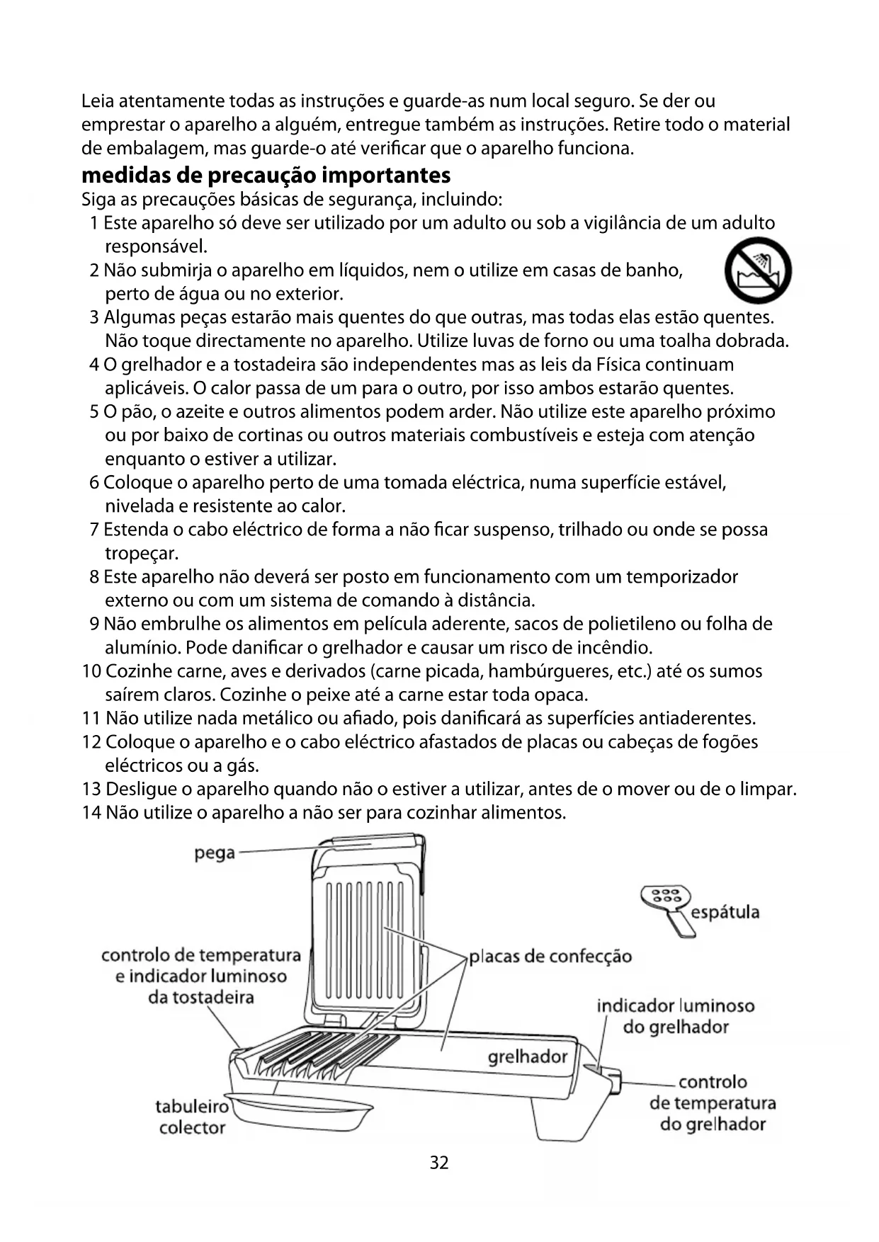 - Pour accompagner viandes et pâtes. Peut également servir de garniture pour un sandwich aux légumes grillés dans un pain pita ou un morceau de baguette.32 Leia atentamente todas as instruções e guarde-as num local seguro. Se der ou emprestar o aparelho a alguém, entregue também as instruções. Retire todo o material de embalagem, mas guarde-o até verificar que o aparelho funciona. medidas de precaução importantes Siga as precauções básicas de segurança, incluindo: 1 Este aparelho só deve ser utilizado por um adulto ou sob a vigilância de um adulto responsável. 2 Não submirja o aparelho em líquidos, nem o utilize em casas de banho, perto de água ou no exterior. 3 Algumas peças estarão mais quentes do que outras, mas todas elas estão quentes. Não toque directamente no aparelho. Utilize luvas de forno ou uma toalha dobrada. 4 O grelhador e a tostadeira são independentes mas as leis da Física continuam aplicáveis. O calor passa de um para o outro, por isso ambos estarão quentes. 5 O pão, o azeite e outros alimentos podem arder. Não utilize este aparelho próximo ou por baixo de cortinas ou outros materiais combustíveis e esteja com atenção enquanto o estiver a utilizar. 6 Coloque o aparelho perto de uma tomada eléctrica, numa superfície estável, nivelada e resistente ao calor. 7 Estenda o cabo eléctrico de forma a não ficar suspenso, trilhado ou onde se possa tropeçar. 8 Este aparelho não deverá ser posto em funcionamento com um temporizador externo ou com um sistema de comando à distância. 9 Não embrulhe os alimentos em película aderente, sacos de polietileno ou folha de alumínio. Pode danificar o grelhador e causar um risco de incêndio. 10 Cozinhe carne, aves e derivados (carne picada, hambúrgueres, etc.) até os sumos saírem claros. Cozinhe o peixe até a carne estar toda opaca. 11 Não utilize nada metálico ou afiado, pois danificará as superfícies antiaderentes. 12 Coloque o aparelho e o cabo eléctrico afastados de placas ou cabeças de fogões eléctricos ou a gás. 13 Desligue o aparelho quando não o estiver a utilizar, antes de o mover ou de o limpar. 14 Não utilize o aparelho a não ser para cozinhar alimentos.33 15 Não utilize o aparelho se estiver danificado ou se o seu funcionamento for defeituoso. 16 Se o cabo eléctrico estiver danificado, o fabricante, o seu agente de assistência técnica ou qualquer profissional devidamente qualificado deverá substituí-lo para evitar qualquer risco. apenas para uso doméstico antes de utilizar pela primeira vez Limpe as placas com um pano húmido. posicionamento 1 Coloque o aparelho perto de uma tomada eléctrica, numa superfície estável, nivelada e resistente ao calor. 2 Deixe um espaço de pelo menos 50mm em toda a volta do aparelho. 3 Encaminhe o cabo eléctrico de forma a não ficar suspenso, trilhado ou onde se possa tropeçar. grelhador ou tostadeira? 4 O grelhador e a tostadeira são independentes. Pode utilizar cada um deles separadamente, ou ambos ao mesmo tempo. Cada um tem o seu próprio controlo de temperatura e indicador luminoso. 5 Cada controlo de temperatura está regulado do 0 (desligado) ao 3 (máximo). 6 Os indicadores luminosos acender-se-ão quando a respectiva resistência estiver a aquecer, apagar-se-á quando tiver chegado à temperatura correcta e alternará entre aceso e apagado durante o funcionamento termorregulador do termóstato. preparação 7 Prepare todas as guarnições (pepino, tomate, etc.) e parta os pães ao meio. 8 Corte os alimentos a grelhar com espessuras nunca superiores a 25 mm. 9 Coloque o tabuleiro colector centrado por baixo da parte da frente do grelhador para recolher quaisquer resíduos. 10 Unte as placas de confecção com um pouco de manteiga ou óleo de cozinha e feche-o. Não utilize pastas magras de barrar, que podem escorrer e queimar no grelhador. 11 Ligue a ficha à tomada. usar o grelhador 12 Use o grelhador para alimentos como ovos, tomates, cogumelos ou outros alimentos delicados que poderiam ser esmagados ou comprimidos pela tostadeira. 13 Ligue o controlo para a temperatura desejada, espere que a luz se apague e comece a cozinhar. 14 Coloque os alimentos na placa com uma espátula ou com umas tenazes. Não utilize os dedos. 15 O grelhador só cozinha os alimentos de um lado. Isto significa que cozinha de uma forma mais lenta do que a tostadeira, e que tem que virar os alimentos se quiser que fiquem cozinhados dos dois lados. instruções34 usar a tostadeira 16 Ligue o controlo para a temperatura desejada, espere que a luz se apague e comece a cozinhar. 17 Coloque os alimentos na placa inferior com uma espátula ou com umas tenazes. Não utilize os dedos. 18 Feche o grelhador. A dobradiça é articulada para se adaptar a alimentos espessos ou de formato irregular. 19 As placas de confecção devem estar mais ou menos paralelas para garantir uma confecção uniforme. retirar os alimentos 20 Verifique que estão cozinhados. Se não tiver a certeza, deixe cozinhar um pouco mais. 21 Utilize utensílios de madeira ou de plástico para retirar os alimentos. pronto? 22 Desligue o grelhador. mais? 23 Calce as luvas de forno, esvazie o tabuleiro colector para um recipiente termo- resistente, limpe-o com uma toalha de papel e coloque-o por baixo da parte da frente do grelhador. cuidados e manutenção 24 Desligue o grelhador e deixe-o arrefecer antes de o limpar e guardar. 25 Limpe todas as superfícies com um pano limpo e húmido. Utilize uma toalha de papel humedecida com um pouco de óleo de cozinha para remover manchas persistentes. 26 Lave o tabuleiro colector em água morna com detergente ou na prateleira superior da máquina de lavar louça. 27 Tenha muito cuidado com as superfícies antiaderentes. 28 Não coloque o grelhador em água ou em qualquer outro líquido. 29 Não utilize produtos ou solventes de limpeza abrasivos ou fortes. 30 Não utilize esfregões abrasivos, palha-de-aço ou esfregões saponificados. tempos d