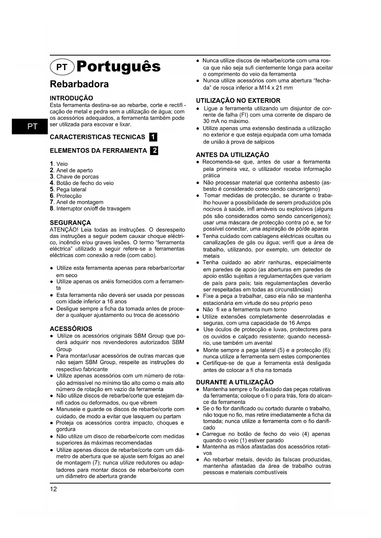 Português Rebarbadora INTRODUÇÃOEsta ferramenta destina-se ao rebarbe, corte e rectifi -cação de metal e pedra sem a utilização de água; com os acessórios adequados, a ferramenta também pode ser utilizada para escovar e lixar.CARACTERISTICAS TECNICAS 1 ELEMENTOS DA FERRAMENTA 2 1. Veio2. Anel de aperto3. Chave de porcas4. Botão de fecho do veio5. Pega lateral6. Protecção7. Anel de montagem8. Interruptor on/off de travagemSEGURANÇAATENÇÃO! Leia todas as instruções. O desrespeito das instruções a seguir podem cauxar choque eléctri-co, incêndio e/ou graves lesões. O termo “ferramenta eléctrica” utilizado a seguir refere-se a ferramentas eléctricas com conexão a rede (com cabo).● Utilize esta ferramenta apenas para rebarbar/cortar em seco● Utilize apenas os anéis fornecidos com a ferramen- ● Esta ferramenta não deverá ser usada por pessoas com idade inferior a 16 anos ● Desligue sempre a fi cha da tomada antes de proce- der a qualquer ajustamento ou troca de acessórioACESSÓRIOS● Utilize os acessórios originais SBM Group que po-derá adquirir nos revendedores autorizados SBM Group● Para montar/usar acessórios de outras marcas que não sejam SBM Group, respeite as instruções do respectivo fabricante● Utilize apenas acessórios com um número de rota-ção admissível no mínimo tão alto como o mais alto número de rotação em vazio da ferramenta● Não utilize discos de rebarbe/corte que estejam da-nifi cados ou deformados, ou que vibrem● Manuseie e guarde os discos de rebarbe/corte com cuidado, de modo a evitar que lasquem ou partam● Proteja os acessórios contra impacto, choques e gordura● Não utilize um disco de rebarbe/corte com medidas superiores às máximas recomendadas● Utilize apenas discos de rebarbe/corte com um diâ-metro de abertura que se ajuste sem folgas ao anel de montagem (7); nunca utilize redutores ou adap-tadores para montar discos de rebarbe/corte com um diâmetro de abertura grande13