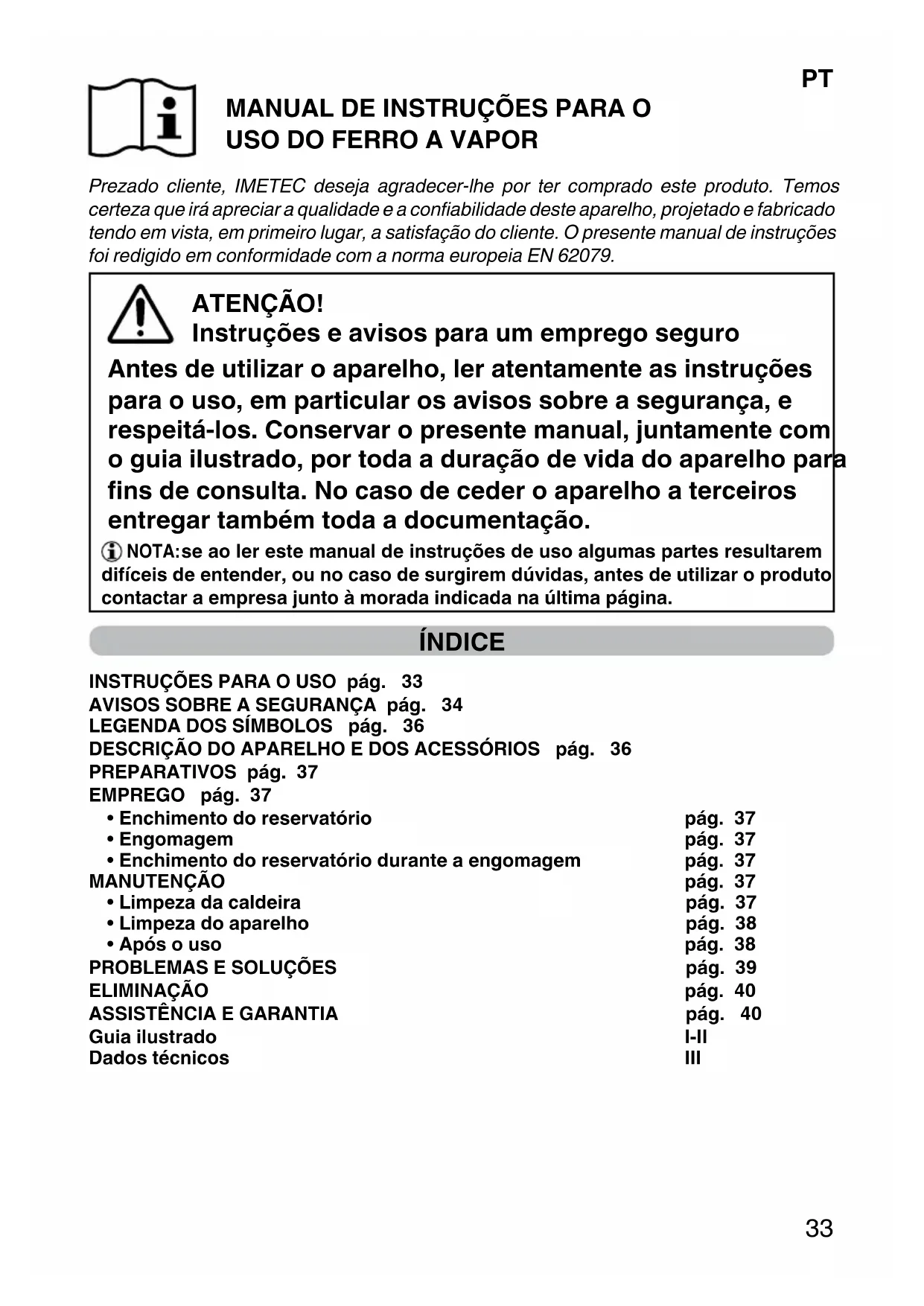 MANUAL DE INSTRUÇÕES PARA O USO DO FERRO A VAPOR Prezado cliente, IMETEC deseja agradecer-lhe por ter comprado este produto. Temos