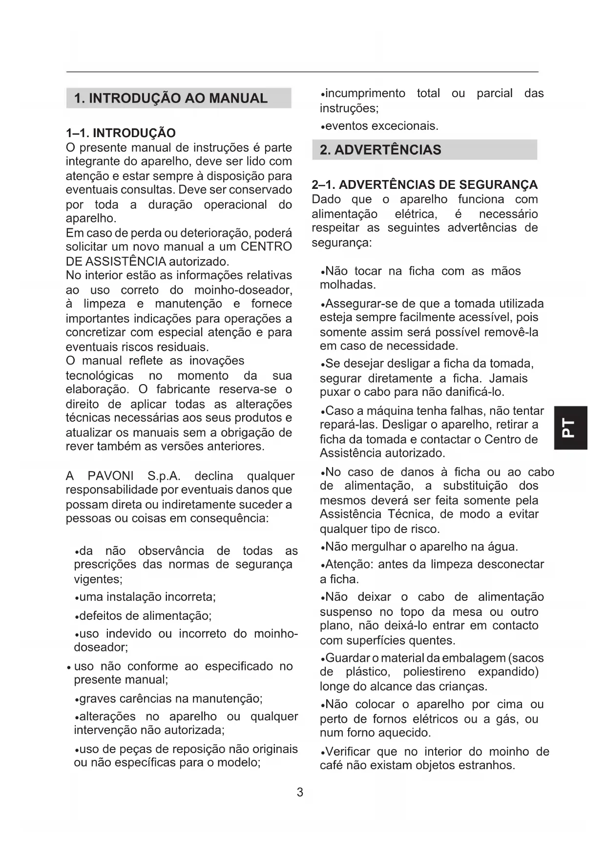 1–1. IntrODUçÃO O presente manual de instruções é parte integrante do aparelho, deve ser lido com atenção e estar sempre à disposição para eventuais consultas. Deve ser conservado por toda a duração operacional do aparelho. Em caso de perda ou deterioração, poderá solicitar um novo manual a um CENTRO DE ASSISTÊNCIA autorizado. No interior estão as informações relativas ao uso correto do moinho-doseador, à limpeza e manutenção e fornece importantes indicações para operações a concretizar com especial atenção e para eventuais riscos residuais. O manual reete as inovações tecnológicas no momento da sua elaboração. O fabricante reserva-se o direito de aplicar todas as alterações técnicas necessárias aos seus produtos e atualizar os manuais sem a obrigação de rever também as versões anteriores. A PAVONI S.p.A. declina qualquer responsabilidade por eventuais danos que possam direta ou indiretamente suceder a pessoas ou coisas em consequência: