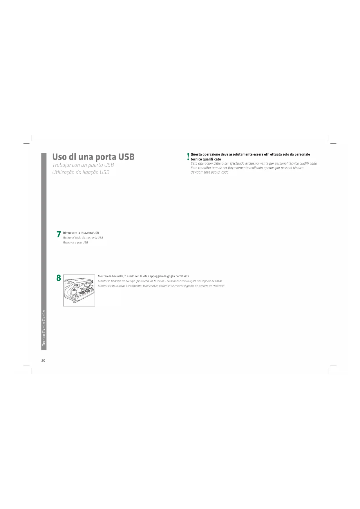 Questa operazione deve assolutamente essere e ettuata solo da personale tecnico qualifi cato Esta operación deberá ser efectuada exclusivamente por personal técnico cualifi cado Este trabalho tem de ser forçosamente realizado apenas por pessoal técnico devidamente qualifi cado Utilização da ligação USB (Modelo S) Trabajar con un puerto USB (Modelo S) Uso di una porta USB (Modello S)89 Tecnico Técnico Técnico