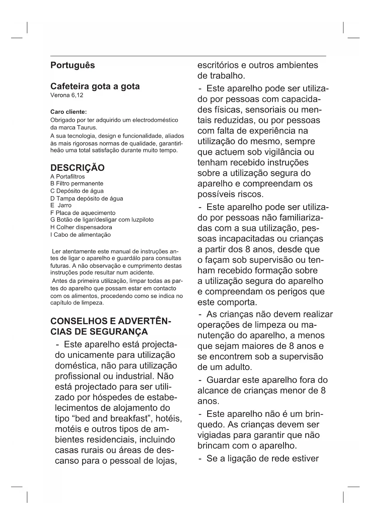 Verona 12 - Máquina de café TAURUS - Manual de utilização gratuito